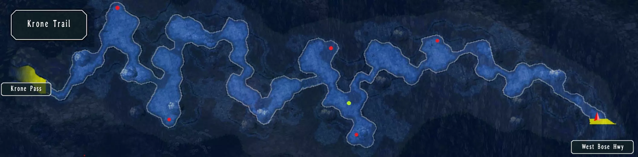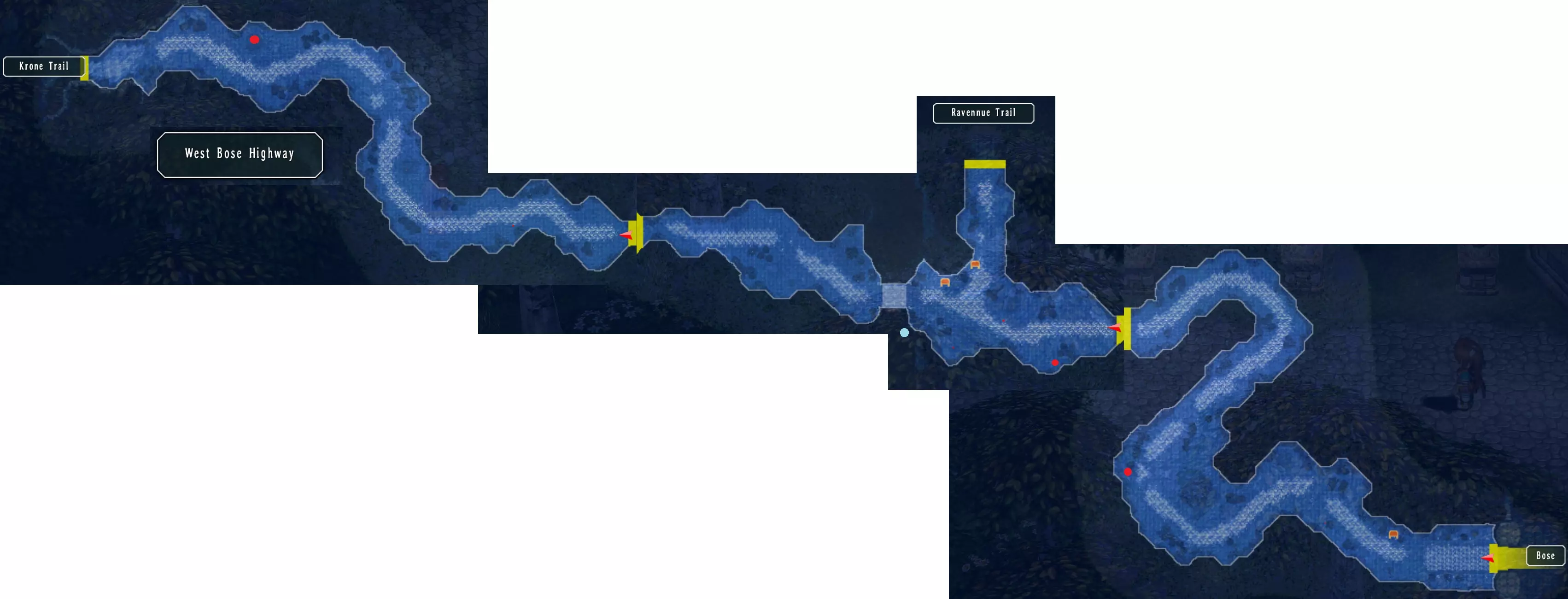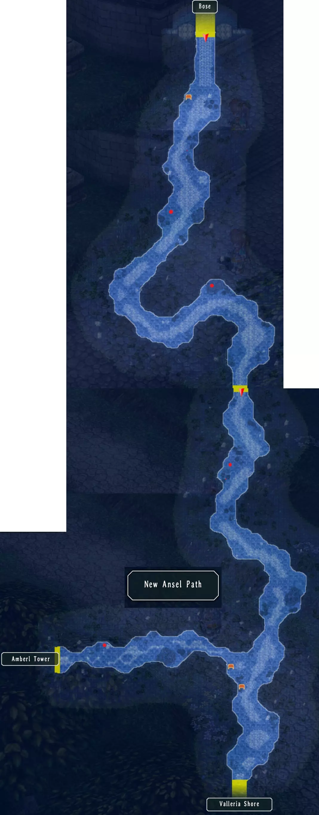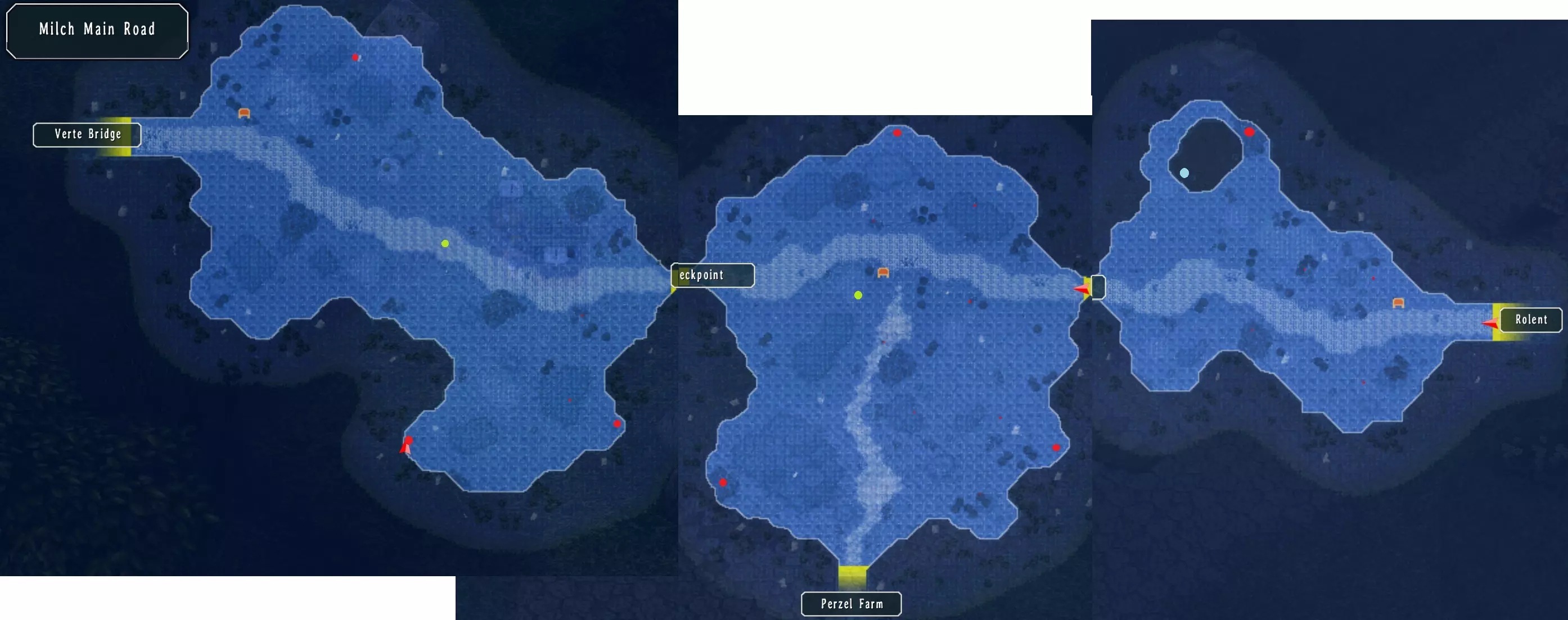 迷雾森林 这里有八个宝箱:EP填充II、狼牙鞭、生存背心、莉莉项链、黑色手镯、神圣 balm、钩爪靴、范围1(168/517),第八个在迷宫里。 树旁有一个钓鱼点,但目前你还无法到达那里。 右侧有宝箱,向上前往下一张地图。 从左侧树干上方有宝箱,从中间树干继续前进,左侧有另一个宝箱。 上方的路径消失了,右侧有另一个宝箱。在宝箱稍下方,向右走可前往下一张地图。 右侧树下有一个宝箱,最右侧有一个宝箱,左上角还有另一个宝箱。米尔希主干道 这里有七个宝箱:水耀石和风耀石各100个、治愈药膏、嗅盐、雷鸣爆弹、绝缘胶带、男士香水、塞拉姆粉末(175/517) 第一张地图的池塘里有一个钓鱼点,旁边有一个宝箱。 下一张地图有三个宝箱。 第三张地图的路中间有目标怪物,这里也有三个宝箱。 米尔希主干道怪物,奖励:4500米拉,4BP(158/382) 维尔特桥的建筑后面还有一个钓鱼点。