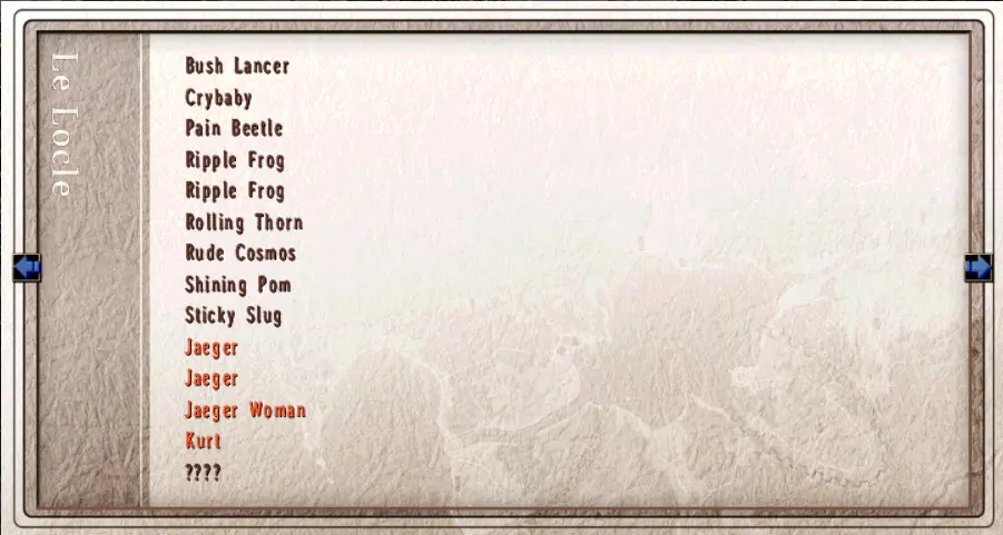 成就:The Mad Tea Party 第四章 空贼要塞 此处共有十二个宝箱:攻击3、EP填充、羽毛胸针、治愈药膏、痊愈药膏、EP填充、EP填充、治愈药膏、治愈药膏、EP填充、全恢复药膏、EP填充II(155/517) 攻击钥匙后门的左后方,最左侧有宝箱。 向右前进,门后有两个宝箱。 继续沿着路向右走没有东西,再向左走,左侧有宝箱,从下方继续前进。 左侧有宝箱,下方有宝箱,向右继续走。 右侧有宝箱,之后沿路前进,门后是桃乐丝和梵德尔。 继续向下,左侧有宝箱,左侧有宝箱,从上方继续前进。 第一、第三和第四个通道有宝箱,继续前往楼梯,在起飞前会与穆勒发生战斗。空贼飞艇 在甲板上与安敦对话,与所有同伴交谈后前往最上层。 此处可钓鱼 (22/26)鳟鱼、潜行头鱼、鲤鱼、瓦莱利亚鲈鱼、利贝尔鲤鱼、珍珠玻璃鱼、食石鱼、鲮鱼、垃圾鱼、格拉纳科尔鱼、虎石斑鱼、虹鳟鱼、亚曼尼鱼 洛连特 公告板四个任务:飞走的戒指、钓鱼点调查、埃利兹街道的魔兽、米尔希主干道的魔兽 道具店:利贝尔新闻6 导力工房:EP3、HP3、EP减少3 傍晚酒吧:三眼浓汤、螺旋面、十段可丽饼、骨汤(45/68) Serra家楼上左侧房间内有赌徒杰克6。 与机场的安敦对话。 与教堂的阿尔芒对话接取失踪戒指任务。下水道中有两个宝箱:EP填充剂、混乱(中)(157/517)和天使像。