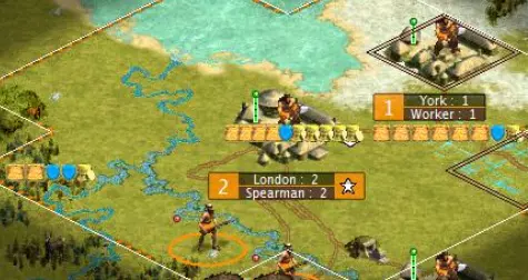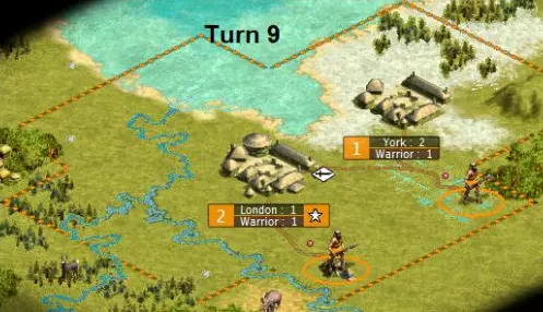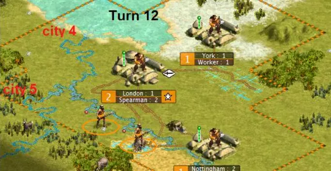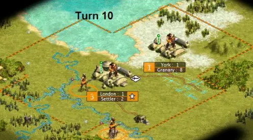 第9回合开始变得有趣起来。你可能会开始质疑我建造如此糟糕的第二座城市的能力。 其实,这座城市本来就应该是这样的。约克是我们的工人工厂。它被苔原环绕,只有3格草原,但一块灌溉过的草原地格就足够了。它永远不会发展到6人口,所以不需要建在河边。说实话,它甚至永远不会超过2人口。它每回合只需要2点生产力,也就是一个工人的建造费用。这座城市只需要很少的资源就能完成它的使命。所以为什么要把好地浪费在它身上呢?把象牙和鹿留给真正需要它们的城市吧。 你可能还会想,为什么我把它建得离首都这么近。为什么不建在那个3格远的山丘上,而是2格远的地方呢?因为这座城市要每回合都生产一个工人。如果我把移民移到那个丘陵上,就得等到下一回合才能建立城市,这意味着城市每回合生产一名工人的进程会延迟一回合。所以这样做会让我损失一名工人。在游戏早期,因敌人攻击而损失一名工人是个重大挫折,对吧?同理,不能尽快建立我们的工人生产基地也会是个重大挫折。 伦敦正在建造一名战士,不过如果我们掌握了青铜工艺或战士法典,就能改建成弓箭手或矛兵了。约克也在建造一名战士,以保持约克的稳定度。 第10回合
