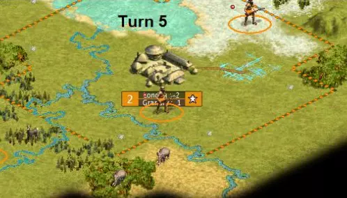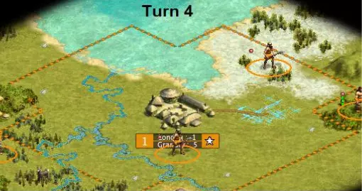 我们的第二个战士出发去探索。现在是时候建造我们的粮仓了。通过让两个工人一起伐木,我们可以在第6回合完成建造。所以我们派第一个工人去森林格子,让第二个工人也开始伐木。第5回合