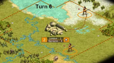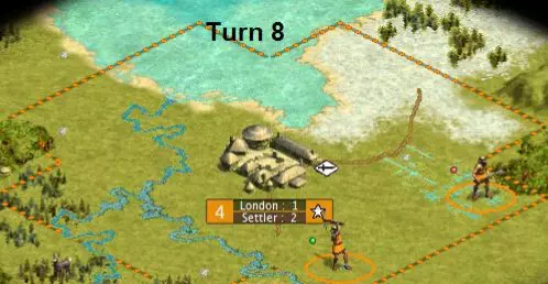 我们的第二个工人开采了一块BG地格,以提高伦敦的生产力。第一个工人则去灌溉另一块BG地格,确保我们的第二座城市能在2回合内发展起来,而不是3回合(就像我们在第1回合对首都所做的那样)。注意,随着伦敦的发展,生产速度会加快。因此,虽然最初显示建造兵营需要4回合,但实际上只需2回合。此外,我们调整了奢侈品滑块,以确保伦敦不会陷入混乱。第8回合