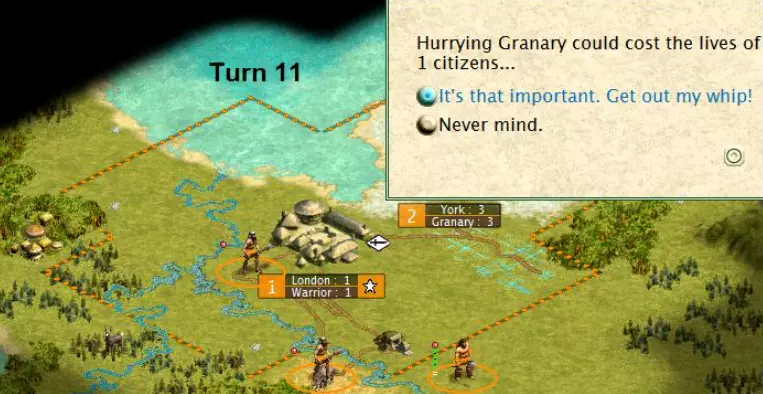 我们即将在约克建造谷仓,但如果某个单位或建筑的建造时间未满一回合,那么加速建造(无论是用金币还是奴隶制)的成本都会翻倍。因此我们本回合开始建造谷仓。我们将一名工人移至草原地块,这样当我们建立第4座城市时,就能有一条通往该城市的道路。第11回合