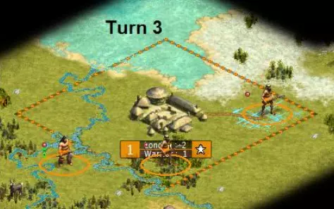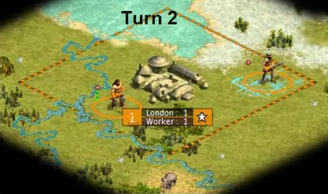我们的战士已训练完成,于是派他去联络盟友并侦察敌人。工人进行灌溉工作。如果先修路再灌溉,城市发展到2级规模会多花一个回合,这是个不利因素。我们将城市生产设置为工人,这会消耗1点人口。要确保城市下一回合处于增长状态(城市名称右侧的数字为“1”),否则将没有足够人口可供消耗,也就无法生产工人。关于如何管理城市以确保其增长的说明,请参见本指南末尾。 回合3