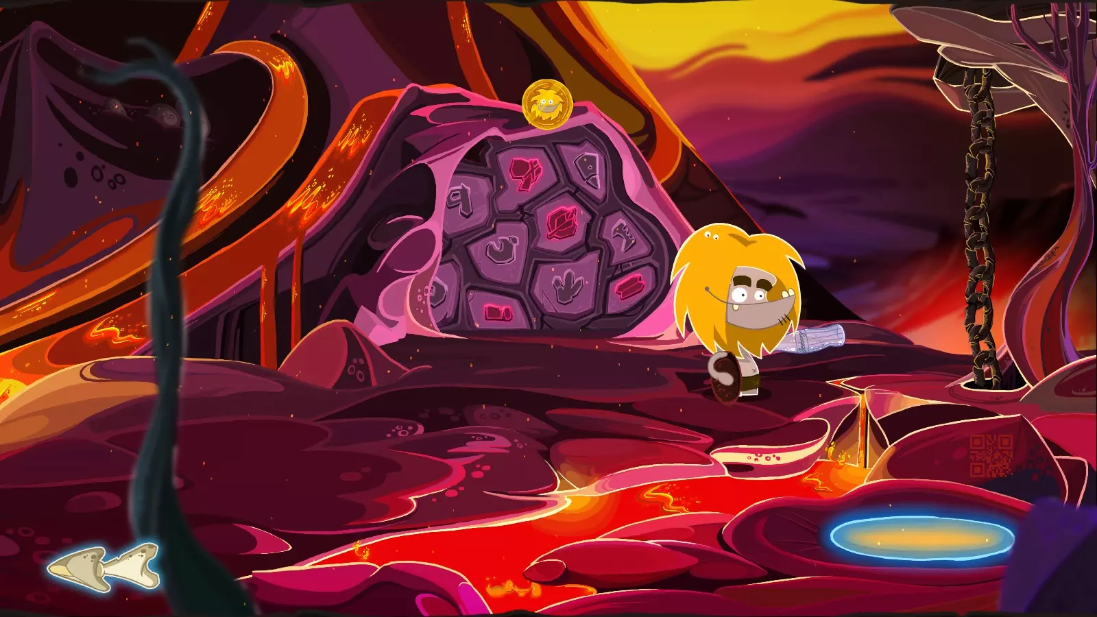 昂克·博加九世 昂格阿古阿托图,乌戈杜尔·博加九世。 第10关 - 火山 拿起火炬,向右走两次。用已知方法清理石头,按照石头上的指示在天空中标记生物(镜像闪电。要移动间歇泉的烟雾,请按石头上的火焰图案)。拉大象的尾巴,进入隧道。 拿起瓶子,摇晃树。右边拿起骨头,用它击落树上的果实。拿起果实,在右边的门上输入密码: