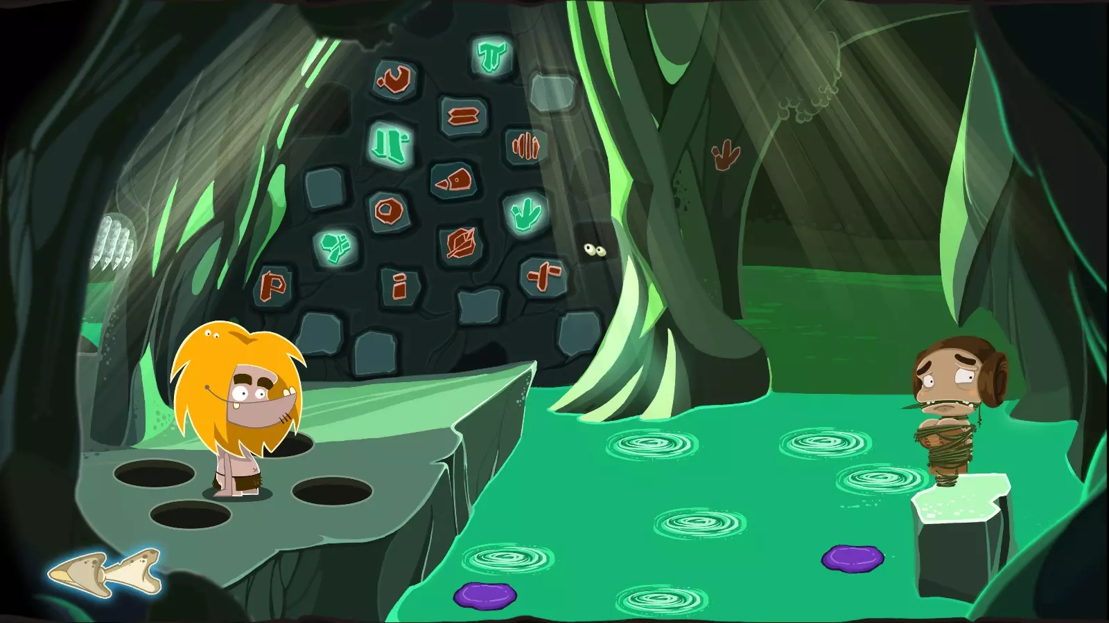 昂克·博加七世 昂格啊古阿托图,乌戈杜尔·博加七世。 第08关 - 洞穴 在洞穴上方找到硬币(22/30),点击那个家伙。从上到下选择选项:1、1、2、2、3、3。在背包中组合物品: 1. 猪 + 腿 = 骨头 2. 骨头 + 石头 = 斧头 3. 斧头 + 猪 = 腿 4. 斧头 + 石头 = 切口 5. 腿 + 火鸡 = 骨头 6. 骨头 + 切口 = 钥匙 拿起钥匙,用它打开门。进入里面。点击章鱼,在上方的隧道中找到硬币(23/30)。找到并引诱发光虫,然后喂给左边的章鱼。将光芒赋予右边的章鱼,向右走。 从硬币处获取光芒,找到发光虫,注意不要碰到虫子。引诱发光虫并将其引向我们取走光芒的硬币处。获得硬币(24/30),再次找到发光虫并喂给右边的章鱼。 将光芒从右边的章鱼转移到中间的章鱼身上,向右走。选择符号: