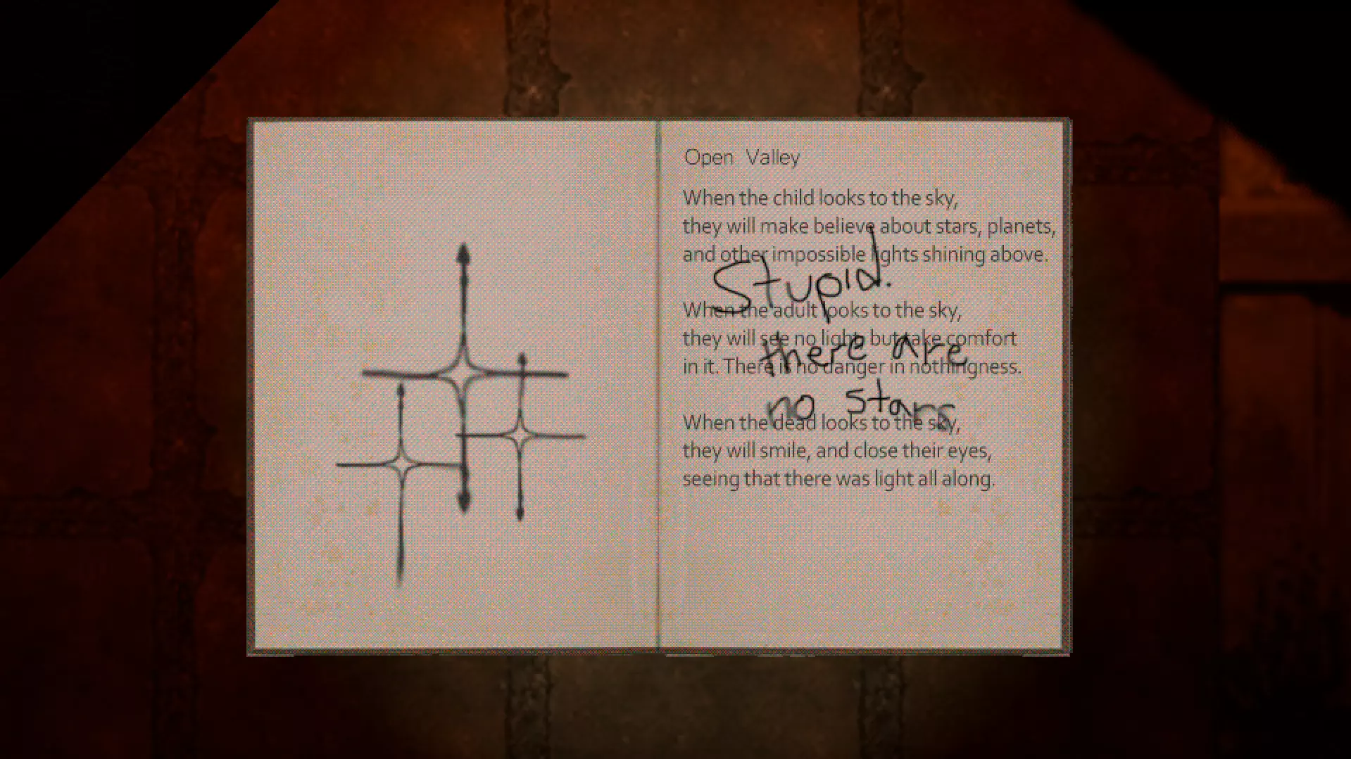 图4,秘密诗篇。显然,这里描绘了金星女王、水星国王、万犬之王以及金星女王的孩子,他们是在获得名为【世界之肉】的物品后诞生的。这首诗讲述了他们的故事,他们看起来就像一个普通的家庭,不是吗?根据图书馆里发现的那篇笔记,科学家们将他们称为【考尔德曼四神】。他们也可以被称为神明,正进行着一场吉祥而神圣的旅程,穿越太空与星辰(因为神明就居住在那里,记得吗?)。诗篇还暗示这些神明拥有创造与重塑世界的能力。因此,我认为女王和国王是现实的两大基本法则,一为男性,一为女性。金星女王代表着现实中混乱、非理性的女性原则——混沌;水星国王则代表着现实中有序、理性的男性原则——逻各斯。他们共同创造了一个孩子,即“世界之肉”或“世界灵魂”,它是通过“逻各斯精子”(即具有生殖力的逻各斯)使惰性物质受精而产生的,充当着神界与人类世界之间的中介。 结论