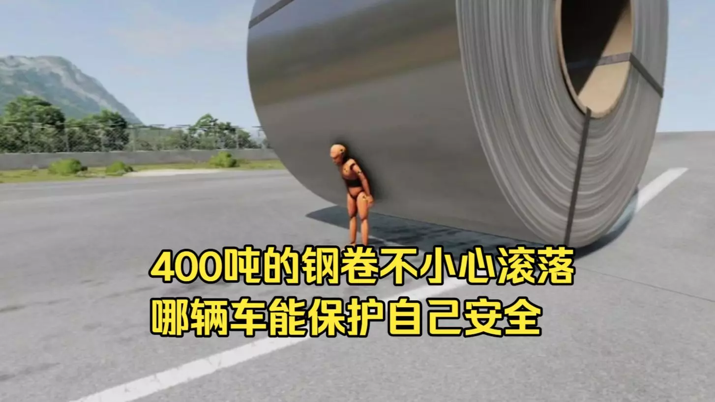 这是一场模拟测试,当400吨钢卷滚落时,测试三轮车、公交车、重型卡车等不同车型能否抵御钢卷冲击,以此探究不同车型的抗冲击防护能力。