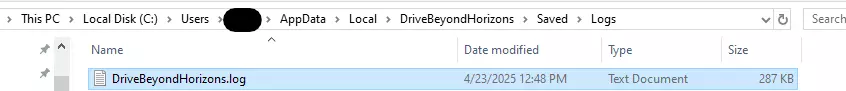 以及一个未完成的高尔夫。现在前往文件夹C: Users YOUR_USER AppData Local DriveBeyondHorizons Saved Logs,寻找名为“DriveBeyondHorizons.log”的文件。