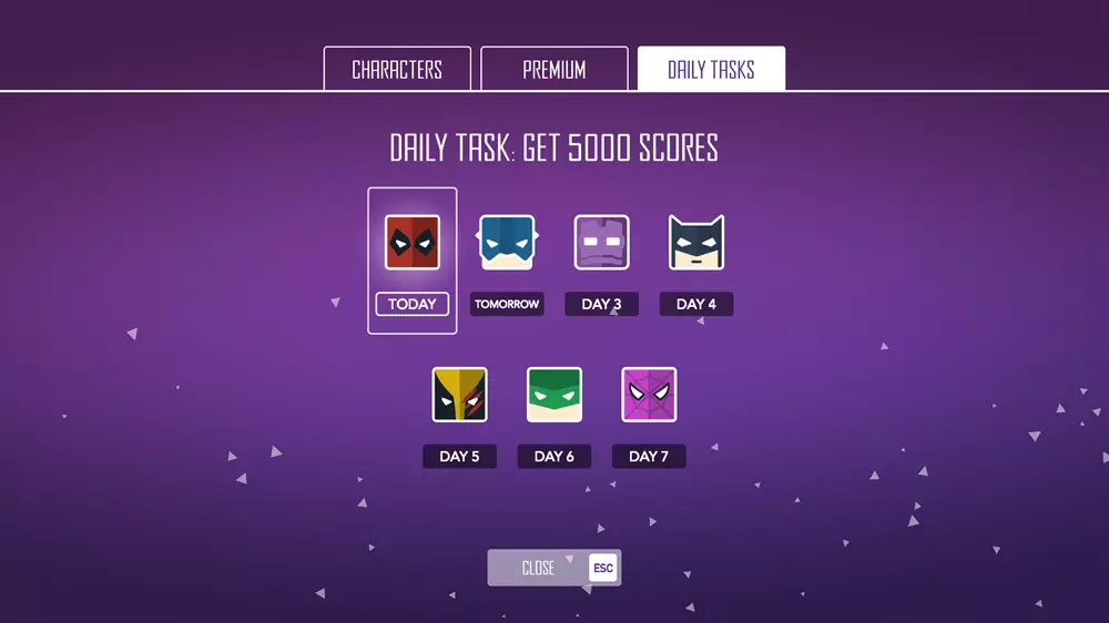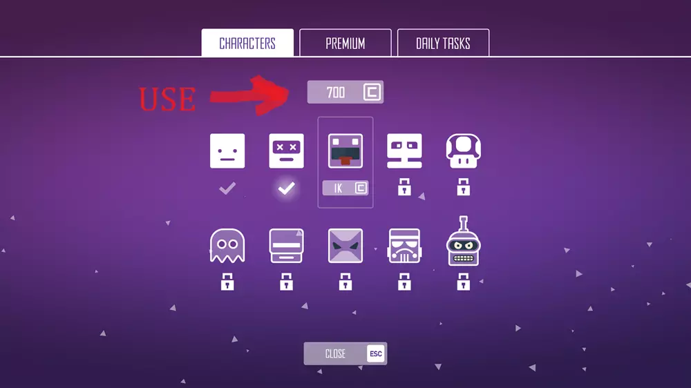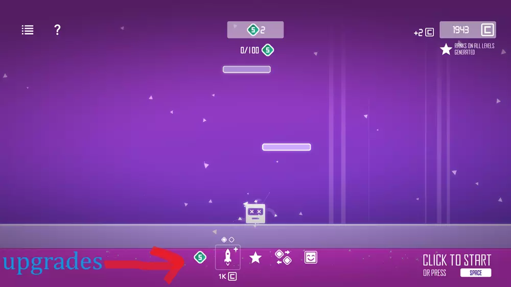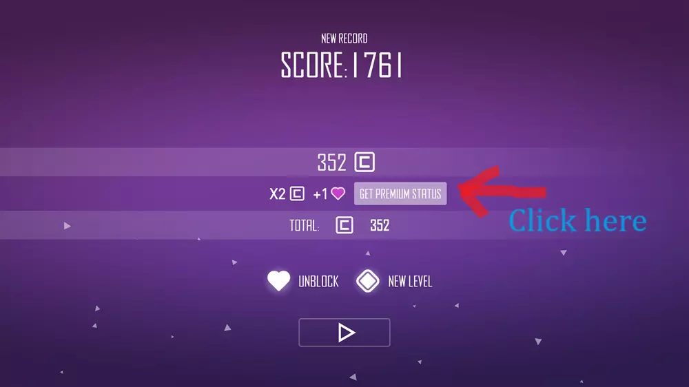 小贴士 尽可能快速移动,但要瞄准你需要跳向的上方线条中心(如果可以的话)。 如果距离较远,按住鼠标左键可获得额外高度。 当得分达到1000分时,游戏会让你快速向上移动,我在这种情况下失败过,所以要做好准备,迅速跳向下一条线。 下方图片1显示点击获取高级版(无需购买任何东西),这会带你进入一个菜单(见下方图片2),在那里你可以看到每日任务和可购买的新角色(见下方图片3)。你还可以使用火箭等升级道具,火箭能让你向上飞行约700-800点距离,其他升级道具可参见下方图片4。
