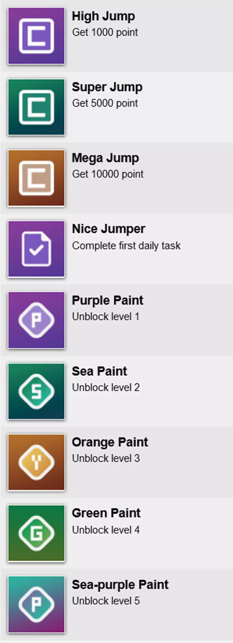 成就 所有成就均通过获取更高分数解锁新关卡来获得。所有关卡都有时间限制,所以放轻松享受游戏过程,最终你会解锁所有成就的。