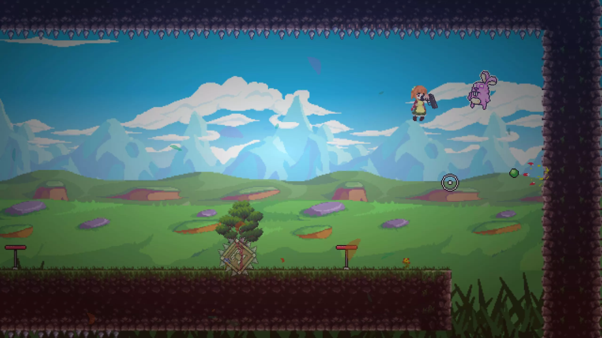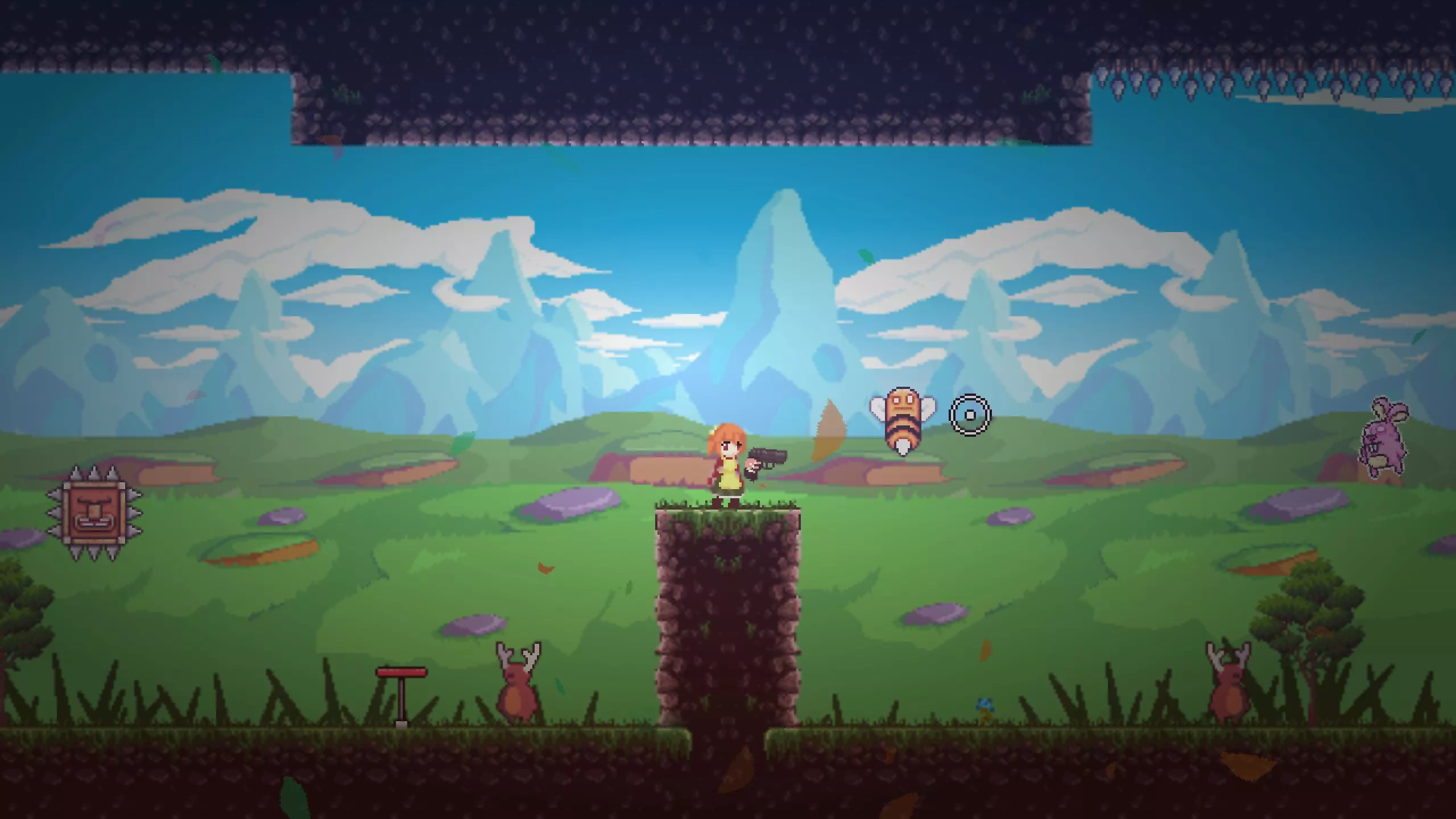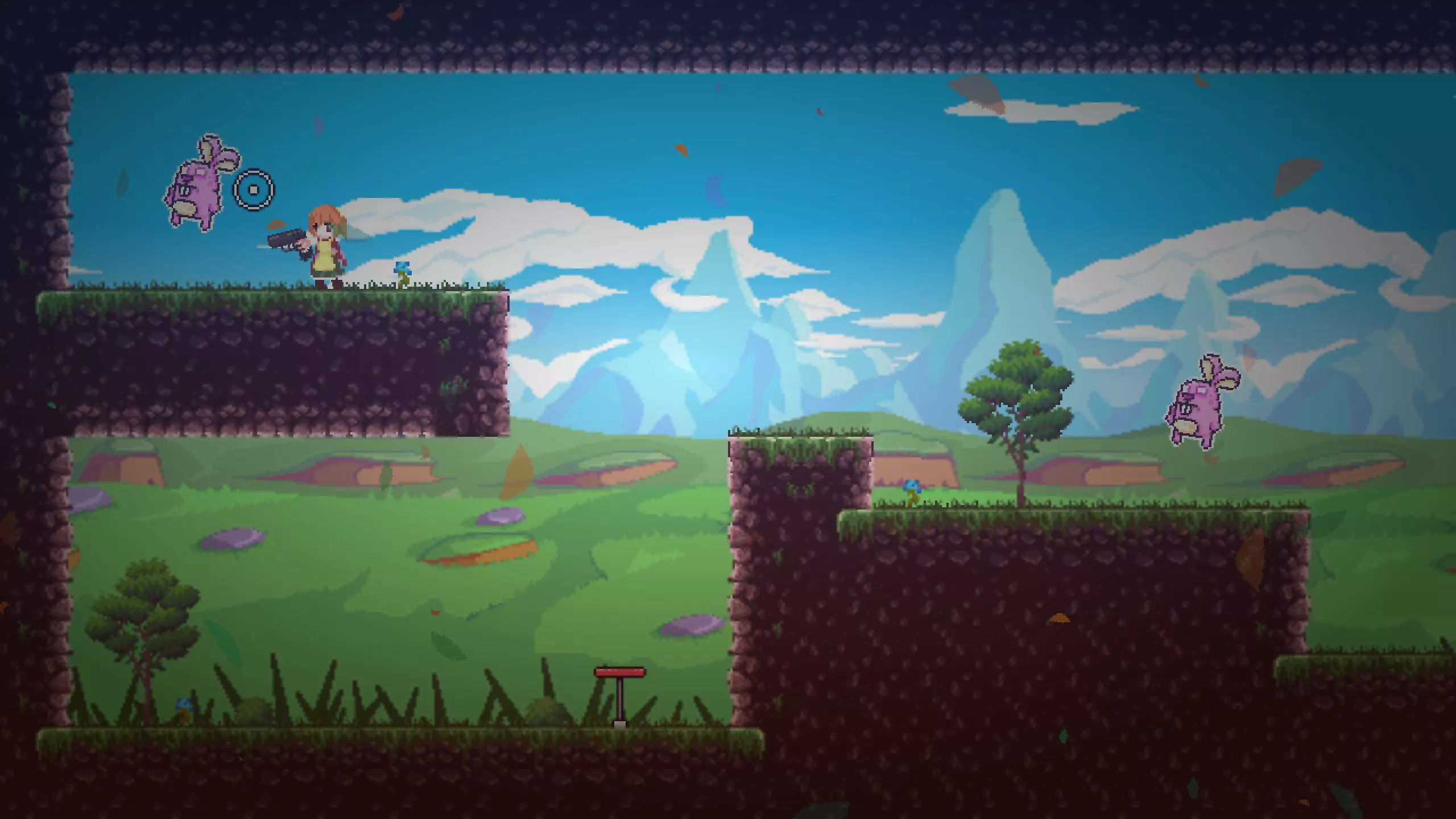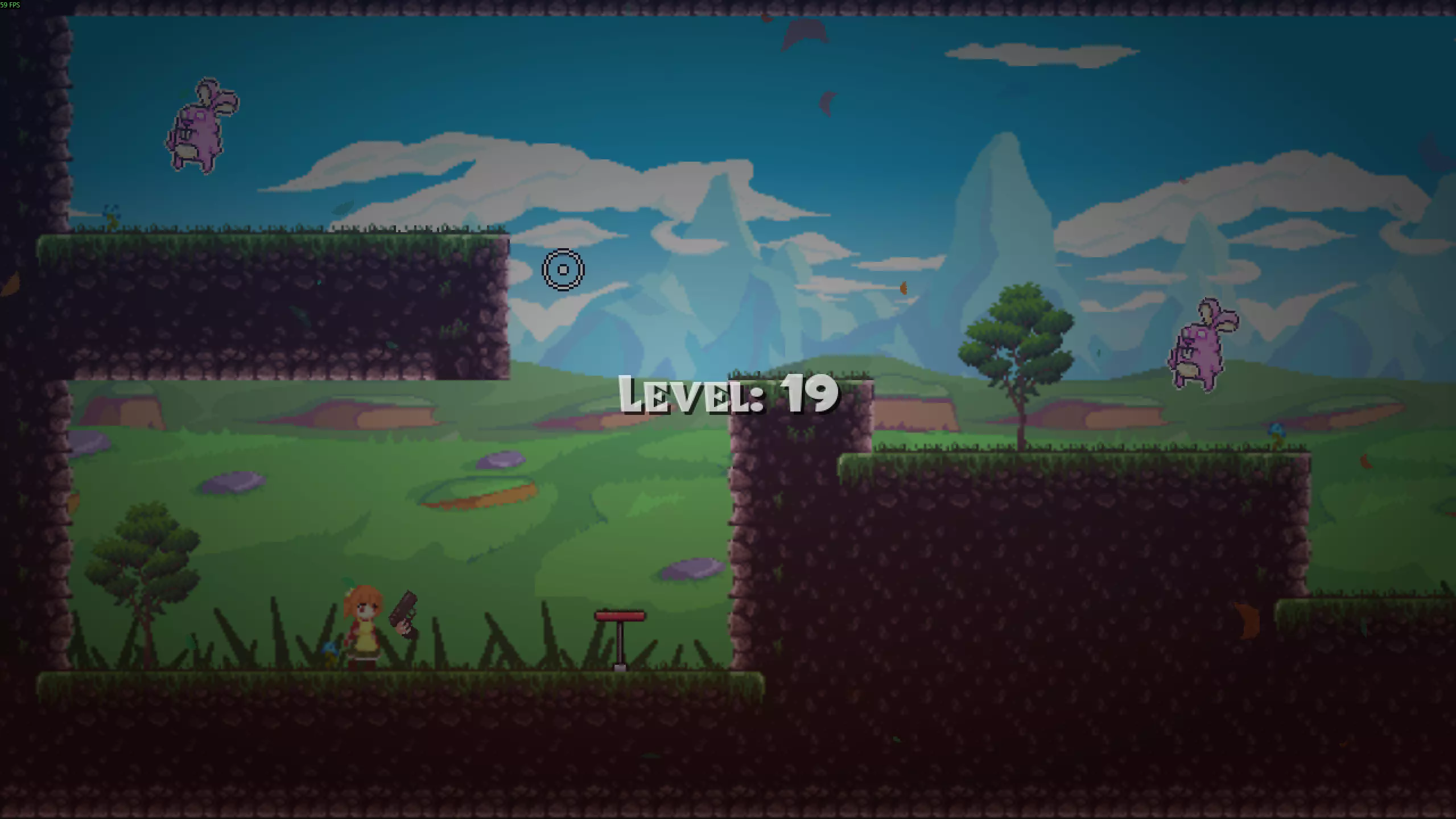 操作说明 A - 向左移动 D - 向右移动 W - 按一下 - 跳跃一次,按两下 - 二段跳 鼠标左键 - 射击(弹药无限) E - 暂停 Esc - 菜单 另外,如果在弹跳平台上使用二段跳,可以缩短从该平台起跳的距离。这在第十关可能会有所帮助:要拾取粉色兔子,从平台跳起并在碰到上方尖刺前执行二段跳。