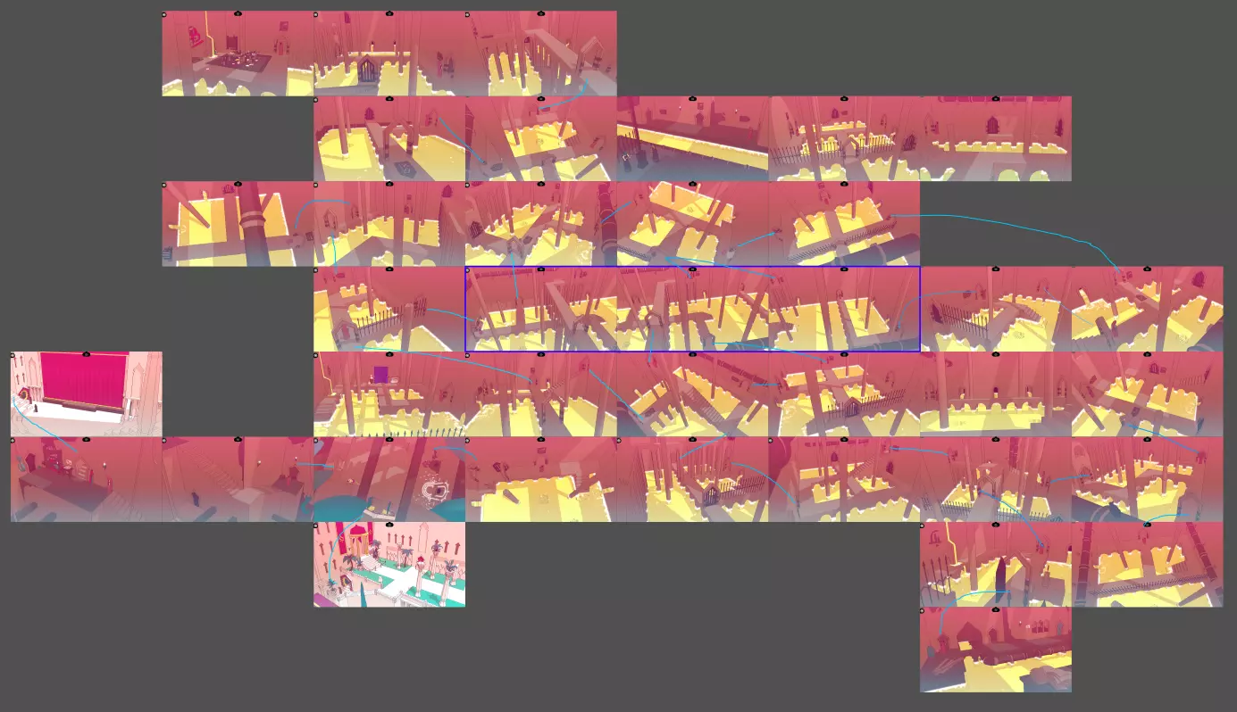 这是一张拼接式的下水道地图,由多块场景画面组合而成,蓝色线条标注出场景间的行进路线,清晰呈现出下水道的整体布局与通行路径,方便探索者规划行进路线。
