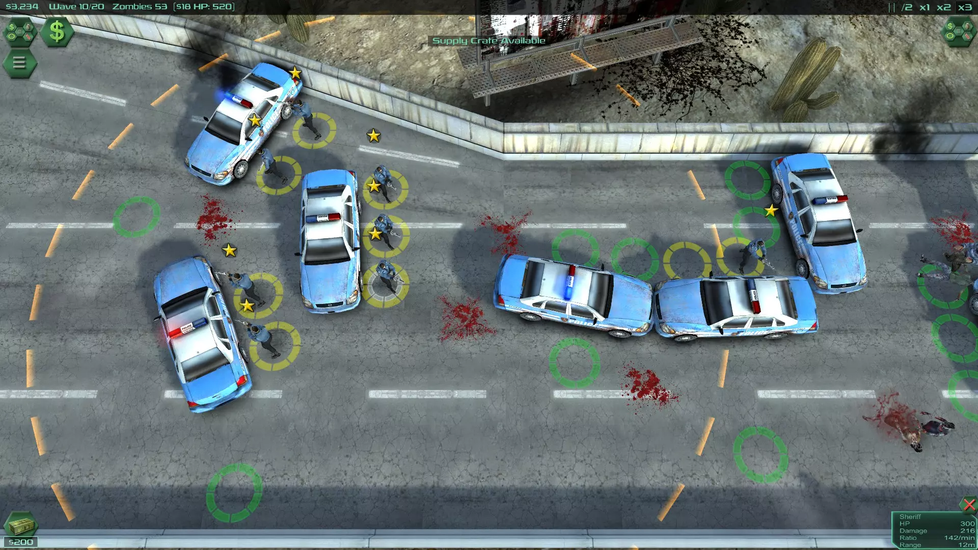 警长 - 选定单位名称 生命值 - 单位在死亡前能承受的伤害量。 伤害 - 单位每次射击造成的伤害量,非每秒伤害值。 射速 - 单位每分钟的射击次数。 射程 - 单位的射击距离。(参见升级部分) 尽快获取海军陆战队,他们拥有比警长更远的射程,配备自动步枪。可升级榴弹发射器,相当于每隔几秒单位就会自动发射一枚免费的手榴弹。 炮塔在游戏初期对付新增敌人(步行者)非常有帮助,这样你的主力单位就能集中火力对付其他类型的僵尸。炮塔不会攻击飞鸟或爬行者。 何时结束地图:通常在第15-20波左右结束是个不错的选择。 原因?金钱 (通常在第20波左右,你应该已将所有必要单位升至满级,以便为接下来的5-10波积攒金钱。) 金钱 原因在于,你手头的现金越多,每击杀一个僵尸获得的金钱就越少,而且波次会越来越难。所以,如果你损失了一个单位,可能需要一整波的时间才能重新购置(显然取决于该单位的价格)。 前期,你每击杀一个僵尸能获得20多美元,而到了后期,这一数值会降至4美元以下。这完全取决于你觉得地图的难度如何,以及如果你觉得简单的话,你想花多少时间去刷钱。一旦你到达20波及以后,每整波大概只能获得400-600美元,因为此时每个僵尸仅掉落3美元。 升级 即将推出。 地图 本节将介绍地图中单位放置的总体思路。 地图 - 刷钱部分 如何刷取金钱。我发现这张地图最适合刷资源,原因可能是你只能使用警长,而且能在10-15分钟内早期获得约20000美元。以下是具体策略: