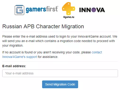 打开您注册Innovex/Fogeym账户时使用的邮箱,查找包含验证码的邮件。注意:Innovex已向所有APB玩家发送验证码。如果没有收到验证码,请在GamersFirst网站上点击【没有验证码?】,输入注册Fogeym账户时使用的电子邮箱,然后点击【发送迁移验证码】。