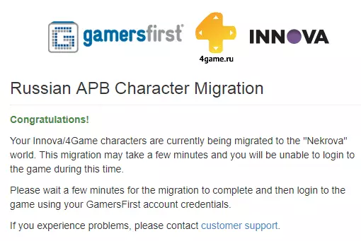 就这样!欢迎来到内克罗瓦服务器。 对于大多数玩家来说,转移过程会瞬间完成,但在某些情况下(如果您有很多角色、物品、邮件),转移可能需要长达20分钟。如果登录游戏时出现10008错误,则表示系统仍在转移您的角色。 常见问题解答 在俄罗斯服务器关闭后,我在Innove上更改了邮箱。没有收到验证码。该怎么办?您需要联系Innove支持(ru.4game.com/support)请求发送代码。 我不是通过邮箱登录的4game,而是通过社交网络登录的。在哪里可以找到代码? 4game会使用您社交网络账号中的邮箱。 我的危险等级是T。应该是这样吗? 是的。 转移后,公会和好友/黑名单列表消失了。为什么? 这是正常现象。公会需要重新创建。 如何转移多个Innove账号中的角色?一个G1账号可以从一个Innove账号转移角色。需要创建新的G1账号。