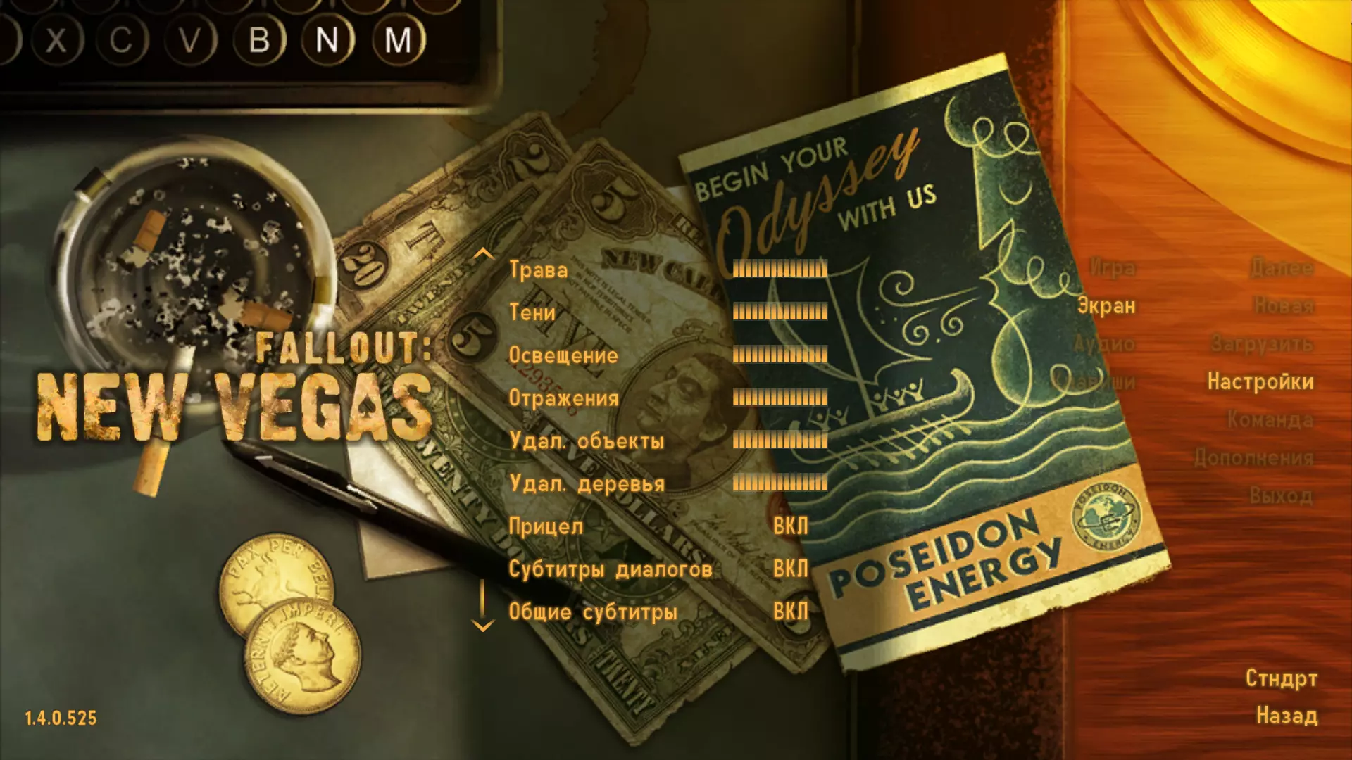 3. 获取FalloutNVLauncher.exe文件和FNV-Localization.zip压缩包 4. 点击齿轮图标-管理-浏览本地文件 会打开游戏文件夹,例如:C: Program Files (x86) Steam steamapps common Fallout New Vegas 5. 将获取的FalloutNVLauncher.exe文件复制并替换原文件 6. 解压FNV-Localization.zip压缩包,并将所有内容复制到以下文件夹:C: Program Files (x86) Steam steamapps common Fallout New Vegas Data 7.在此处删除扩展名为_lang.esp的文件。在我的情况下,只有一个FalloutNV_lang.esp文件。8. 启动游戏。9. 检查游戏内的字幕显示设置:主菜单 - 设置 - 屏幕 - 开启对话字幕和通用字幕(根据需要选择)。