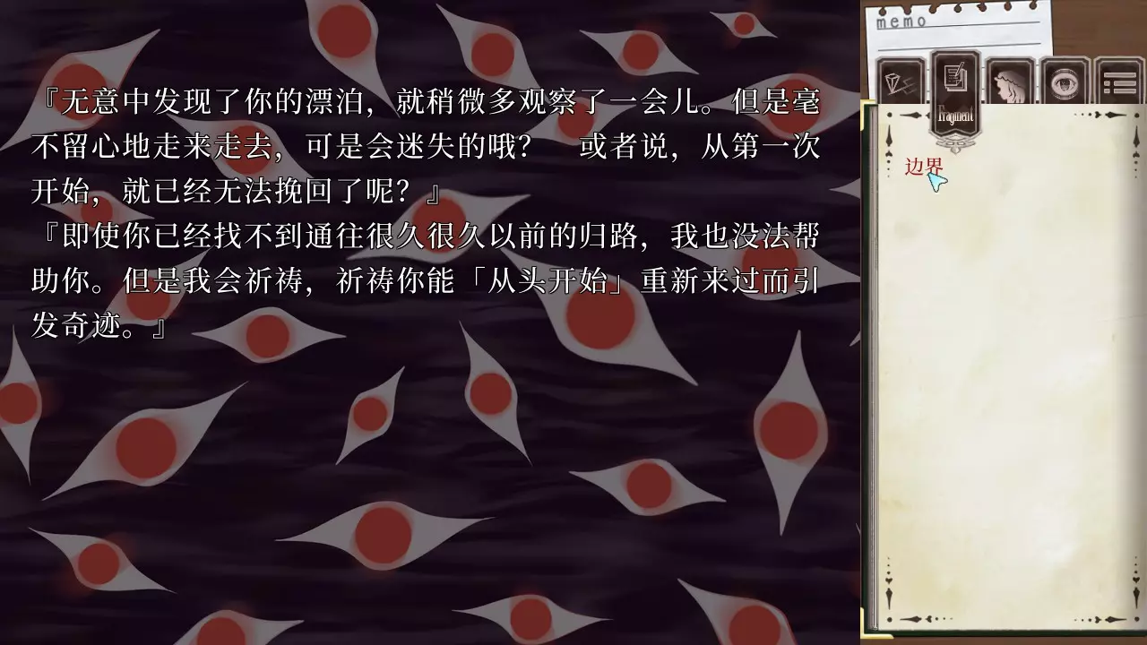 只要一使用路线跳跃,你就会发现原本在碎片栏中的这个【记忆碎片】消失了。 2. 二周目真结局路线关键字 以下为二周目时,进入真结局路线的关键字截图(剧透)。 由于二周目无法使用提示功能直接跳过谜题,因此直接贴出通关路线的关键字截图。 以下内容涉及剧透,已反白显示。