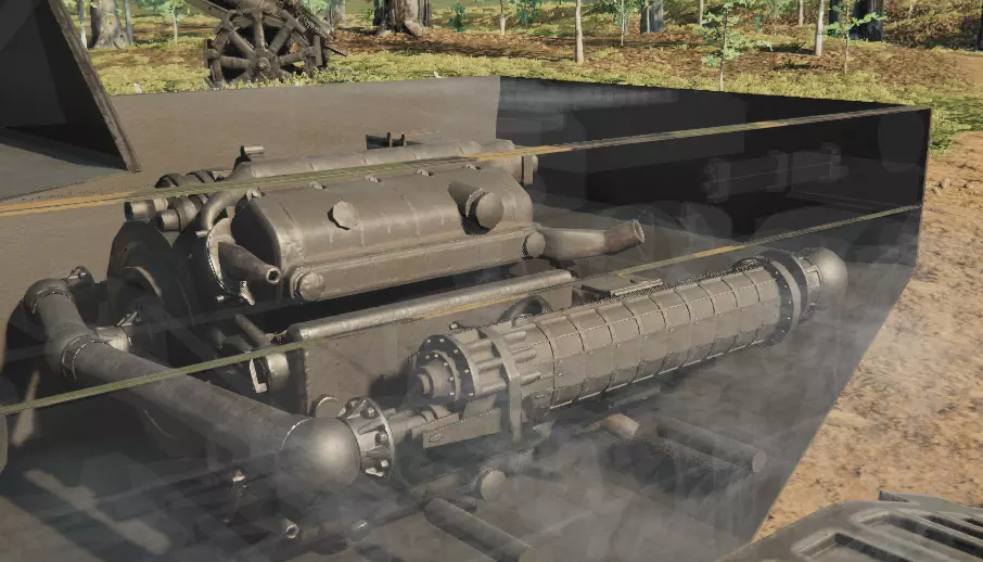 现在调整右上角的俯仰角,直到两段都变为黄色。注意,如果你的炮管比炮塔长,你需要缩短其发射药长度才能使其适配。 步骤3:发动机 选择发动机并将其移动到合适的位置。如果它太高无法安装,可以将其横置。如果仍然无法安装,你需要减小其排量。如果扭杆碍事,右键点击车轮,在右侧菜单中导航至悬挂,将静止角度设为最大。如果它们仍然阻挡发动机,右键点击车轮,在右侧菜单中导航至扭杆,缩短长度直到不再阻挡。不过这会以牺牲悬挂性能为代价。 现在处理变速箱。如果是离合器制动变速箱,将其移动到类似这样的位置。