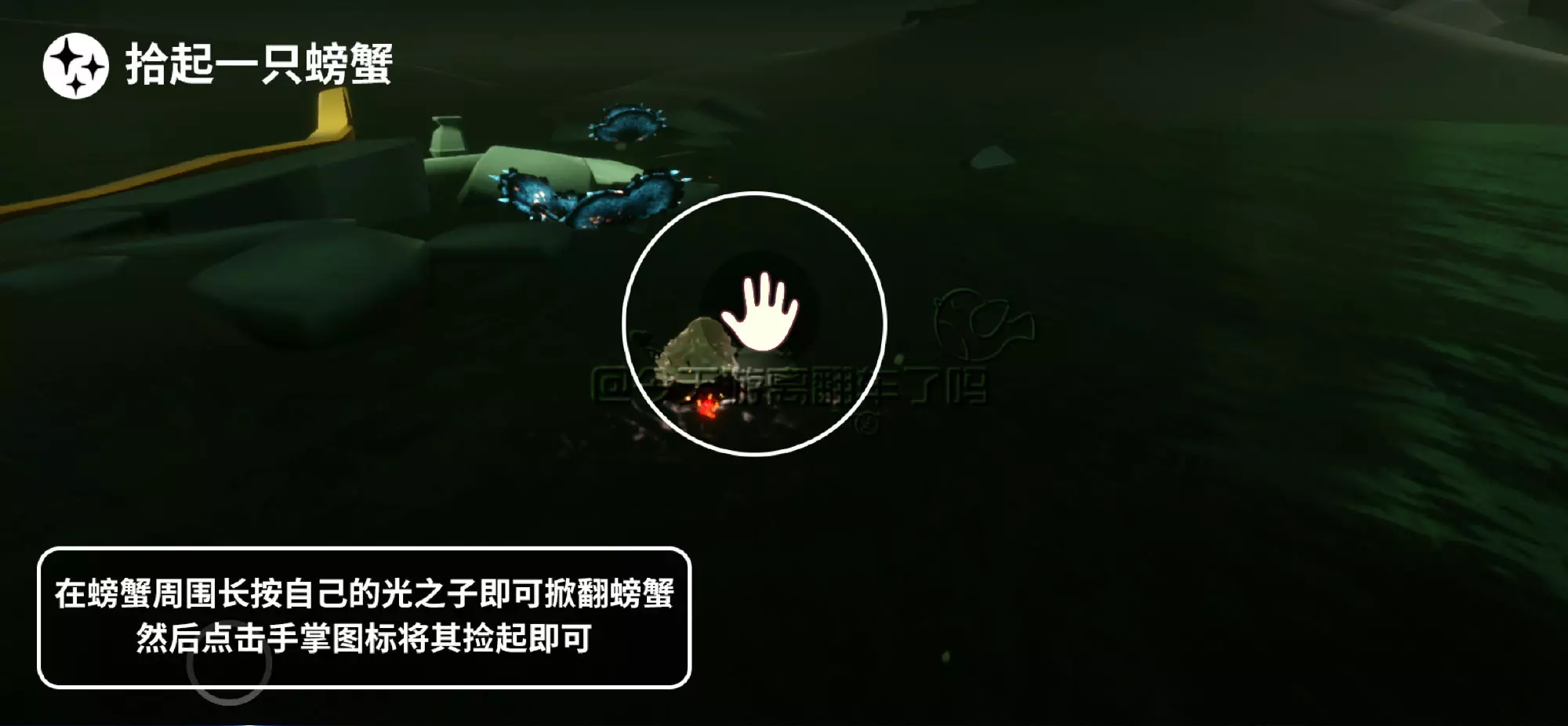「拾起一只螃蟹」在螃蟹周围长按自己大叫掀翻螃蟹后,点击手掌图标将螃蟹抱起即可