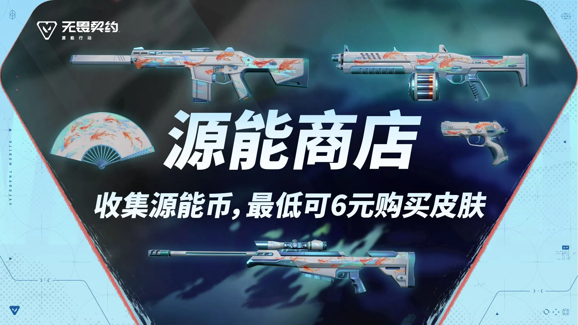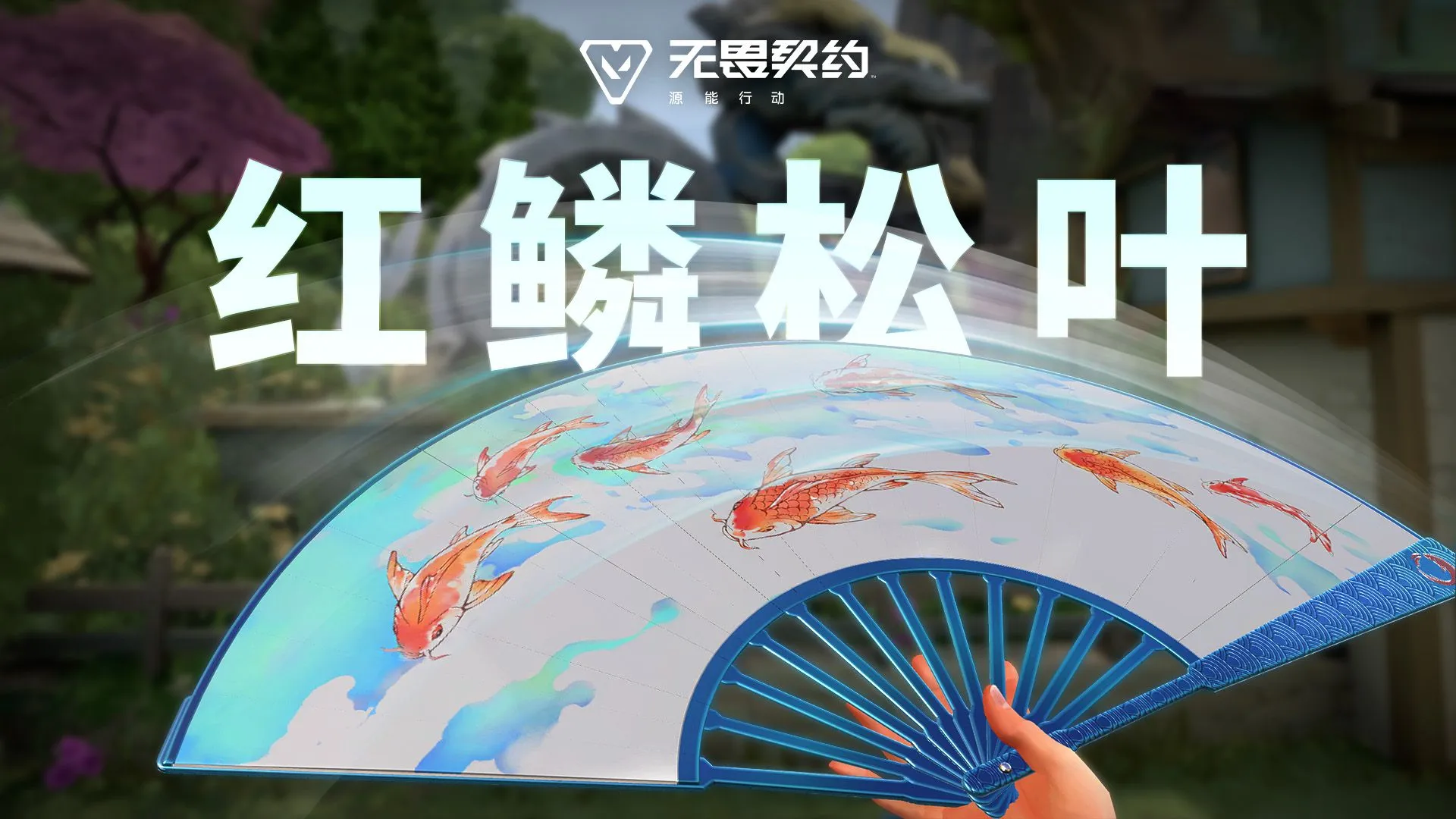 宣白绘朱鲤,蓝墨晕水迹,扇舞锦鲤昭好运——【红鳞松叶】系列皮肤现已于源能商店限时上架!