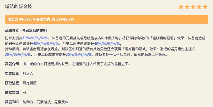 《霜结的誓金枝》是限定祈愿获取的5星弓类武器,适配元素战技、元素反应玩法,能提升防御力、岩元素伤害与结晶反应伤害,后台也可触发效果,还附详细面板与突破材料。