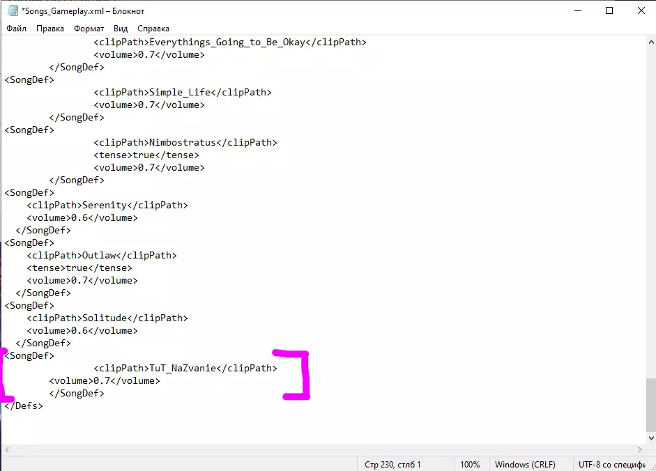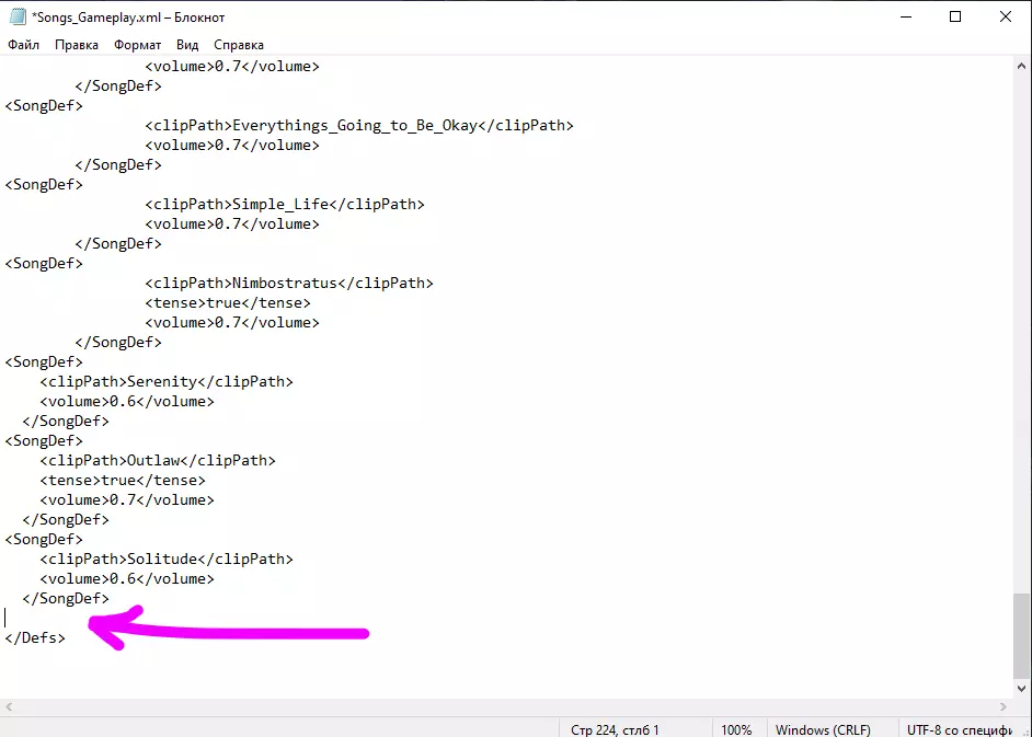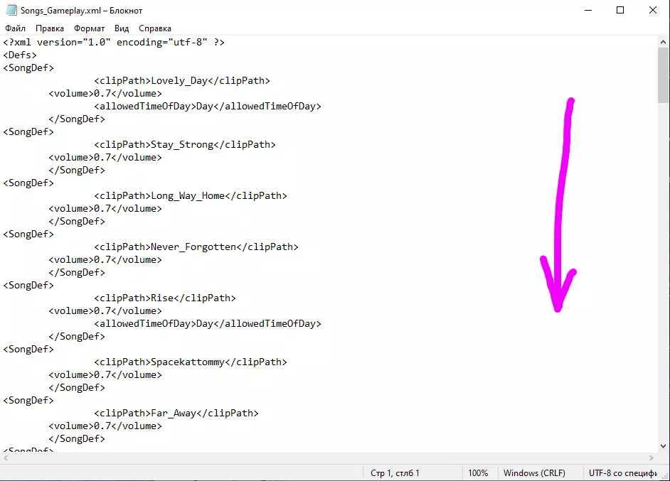 2.现在在该文件夹中进入Defs文件夹(边缘世界 模组 P-Music Defs SongDefs),用记事本打开文件(Songs_Gameplay):在最后一行</SongDef>下方另起一行,插入以下内容: <SongDef> <clipPath>你的音乐英文名</clipPath> <volume>0.7</volume> </SongDef> 示例: