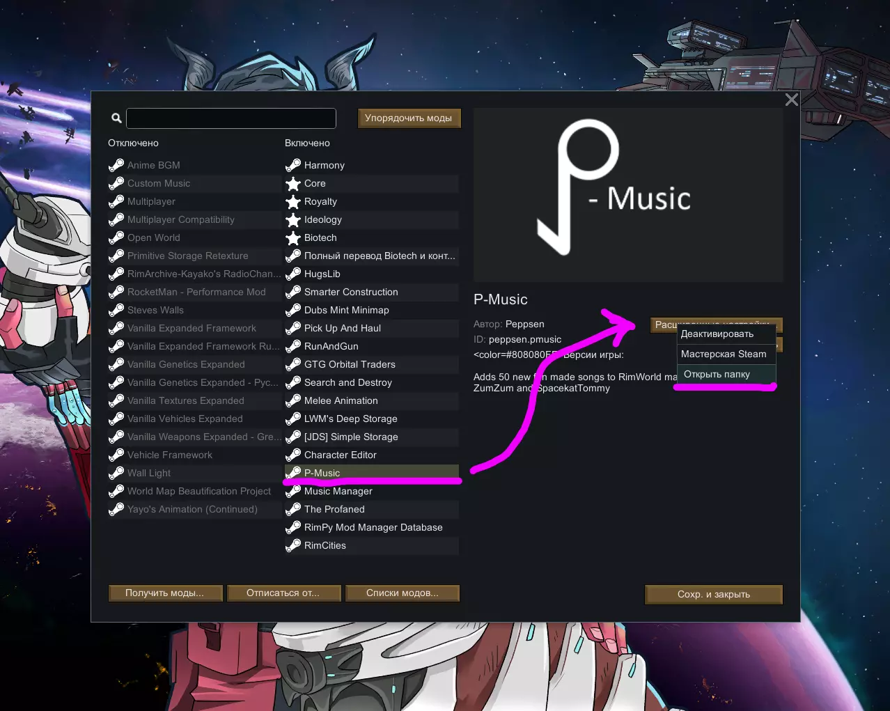 文件可在任意网站进行转换。 若想切换音乐,请安装Music Manager。 完成所有操作后,我们就可以开始了! 1. 将自己的.ogg格式音乐文件放入音乐文件夹(RimWorld Mods P-Music Sounds) 重要!文件名只能包含英文和下划线_(用于代替空格)。 例如: