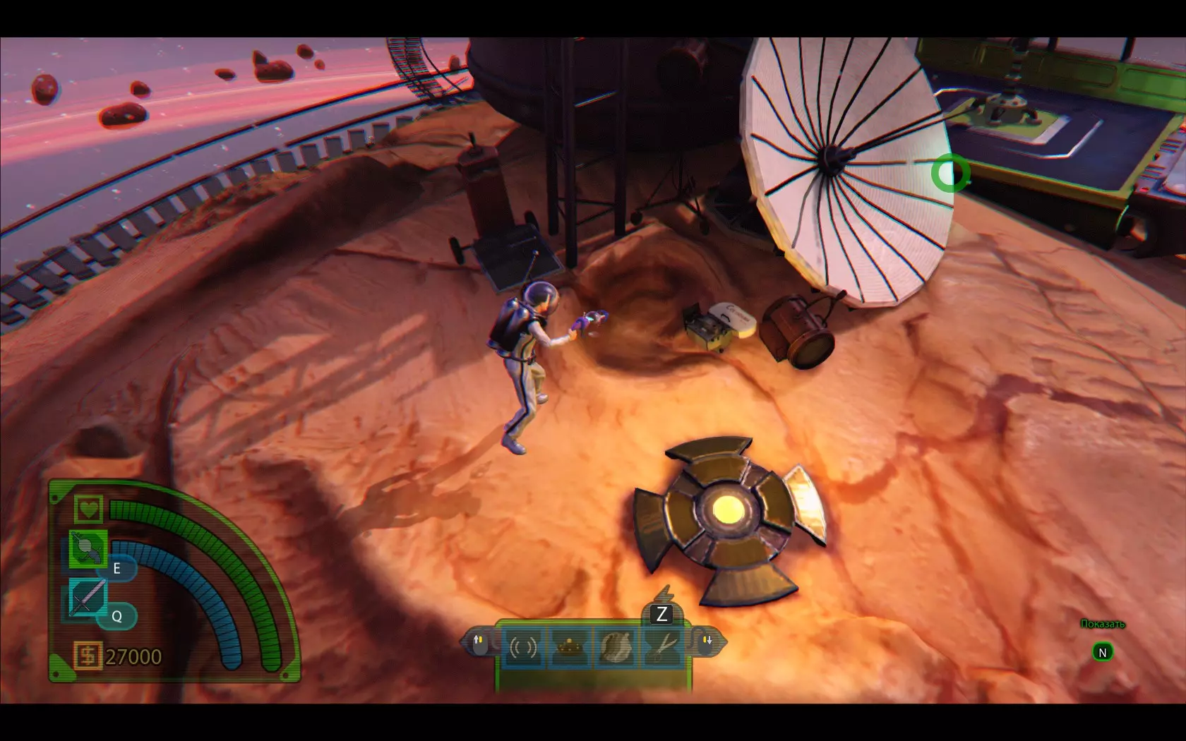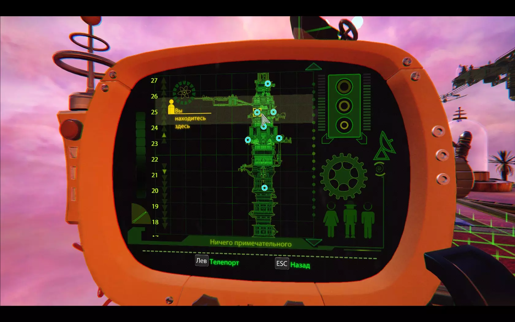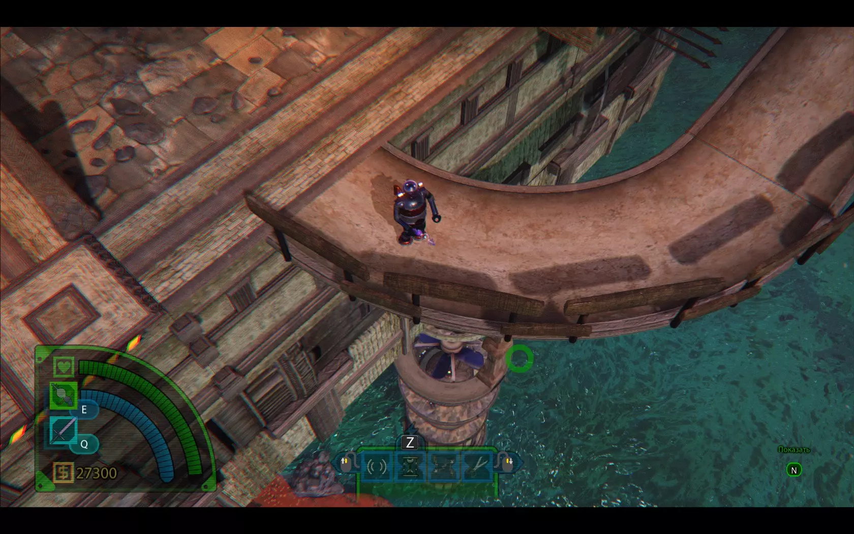 我们走到平台边缘,从下方发现一座带有螺旋桨的塔。