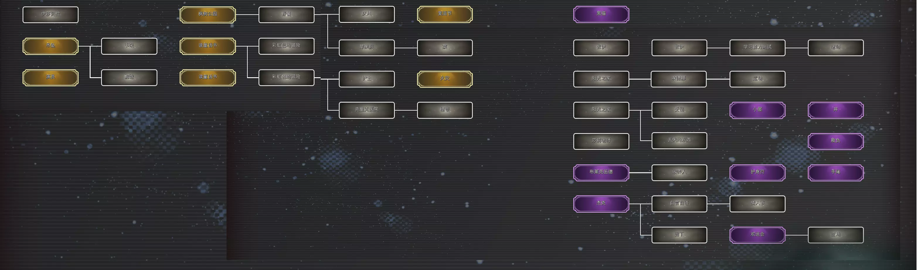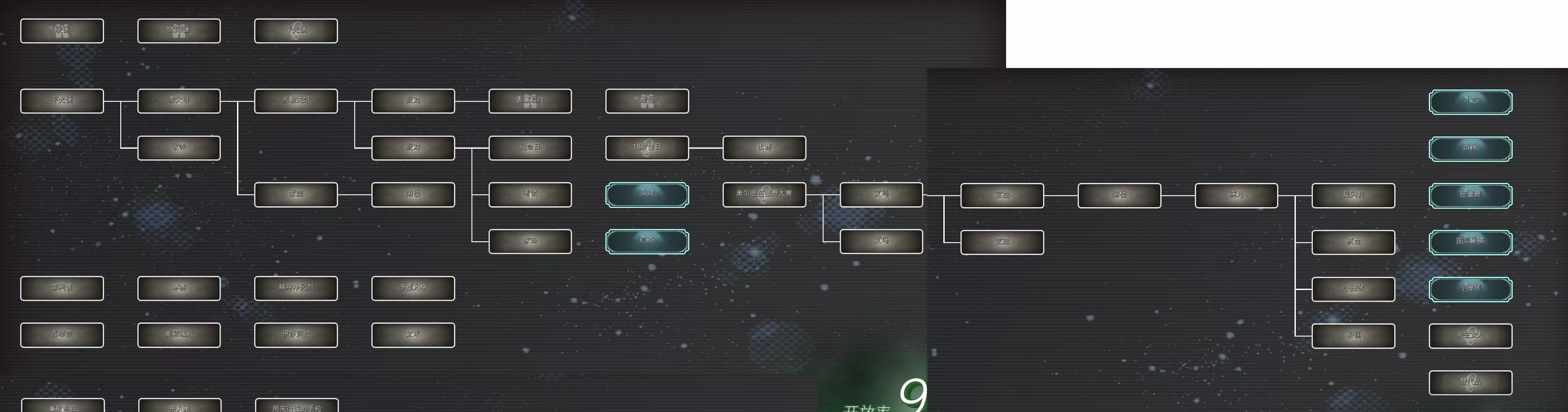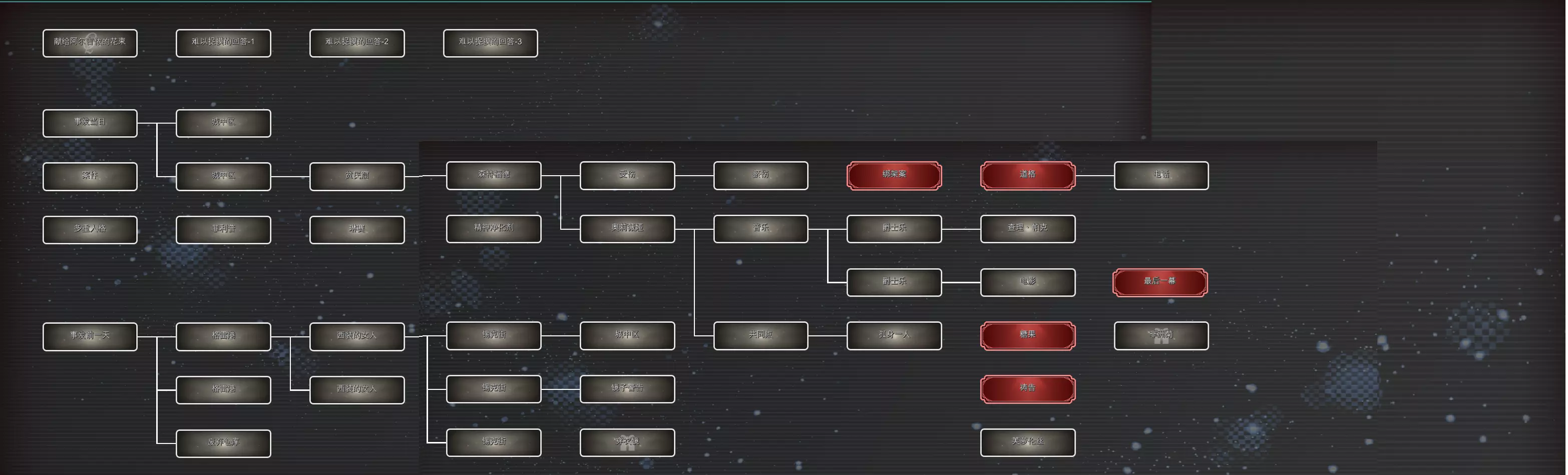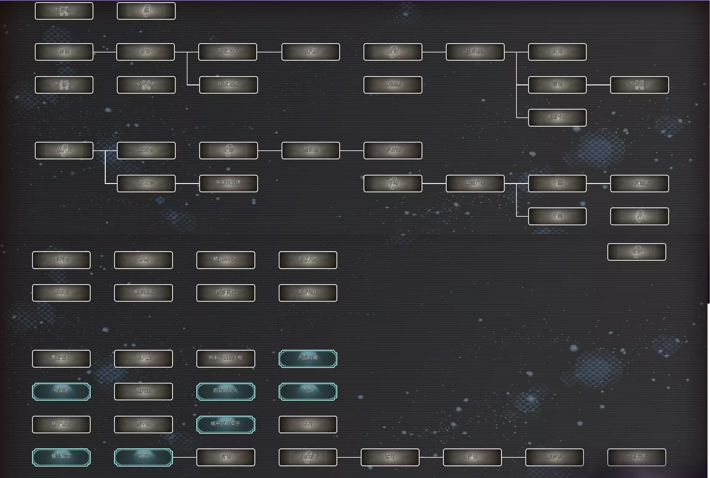 索菲娅以谎言做交换,成功查明真相,并释放了人格融为一体的索菲娅。在解锁成就资料已经齐全的情况下,案件相关内容全部解明(参见流程攻略部分),进入结局流程。 流程攻略 注:仅为我个人流程顺序,收集向的词语不会特意在此处记录。 切换对话对象时用【】标名。 流程开始 【苏菲亚】 名字 迷宫 灰扑扑的感觉 为何老是孤零零地活在世界上? 答:献给阿尔吉侬的花束 我的体内存在着多个“不同的我”。没错 我是—— 答:多重人格 案件 城中区 格雷港 西装 锡克街 城中区 镜子 贫民窟 森特福德 奥莉薇娅 受伤 瘀伤 共同点 孤身一人 音乐 爵士乐 老电影 奥莉薇娅的过去 【奥莉薇娅】 报酬 糖果 【苏菲亚】 糖果 【奥莉薇娅】 彩虹棒棒糖 【奥莉薇娅】 苏菲亚 电影 雌雄大盗 道格 【苏菲亚】 雌雄大盗 道格 电话 【奥莉薇娅】 枪声 森特福德 苏菲亚和奥莉薇娅在森特福德待了一个月的原因究竟是什么呢 答:绑架 圣诞节 圣诞节晚上,奥莉薇娅被□□了 答:枪杀 奥莉薇娅是被谁射杀的呢? 答:警察 奥莉薇娅究竟是什么人呢?绑匪 伊莎贝拉的过去 day2伊莎贝拉登场 【苏菲亚】 吊坠 书架 【奥莉薇娅】 书架 【伊莎贝拉】 靠背 电影的名字好像是—— 答:终极豪赌 【伊莎贝拉】 母亲 瑞秋 枫树公园 【苏菲亚】 枫树公园 野餐 苹果派 庆典 最后一次去枫树公园的那天,她母亲身上似乎发生了什么。那天到底是什么日子呢 答:复活节 【伊莎贝拉】 童话书 缇尔希 精灵 【苏菲亚】 童话书 彩虹色的冒险 扎着马尾辫的主人公的名字是—— 答:伊莎贝拉 克里克医院 护士 绷带 【伊莎贝拉】 彩虹色的冒险 读童话书 读童话书之后,究竟发生了什么呢? 答:火灾 火灾当晚,苏菲亚做了什么呢?苏菲亚对□□“□□□□” 答:见死不救 芙萝伦丝的过去 【苏菲亚】 祷告词 【芙萝伦丝】 她好像有想“戴的东西”。她想“戴的东西”究竟是什么呢? 答:平光镜 养父母 家规 阁楼 米勒 派对 纪念日 【苏菲亚】 养父母 阁楼 红茶 派对 生日 【芙萝伦丝】 16岁生日 比赛 【苏菲亚】 比赛 才艺 芭蕾舞 大赛 【芙萝伦丝】 才艺 芭蕾舞 奥尔登 艾玛 宝拉 阁楼 满月 足尖鞋 棋盘 小提琴 相框 秘密阁楼里留下的照片。照片里的人究竟是谁呢?米勒夫妇的“□□□□” 答:亲生女儿 米勒夫妇是怎么称呼苏菲亚的呢?芙萝伦丝的“□□□” 答:替代品 艾米的过去 通过苏菲亚:大赛触发 【艾米】 蜡笔 艾米在图纸上画的到底是什么呢? 答:猫 黑猫 佐伊 阳光之家 【苏菲亚】 阳光之家 受伤 埃德娜 佐伊 学习能力测试 老师 【艾米】 艾米似乎不太想谈论关于阳光之家的事情。在阳光之家里究竟发生了什么呢? 答:欺负 莎莉 杰克 【苏菲亚】 莎莉 杰克 自言自语 【艾米】 情人节 欢送会 布莱克伍德 【苏菲亚】 欢送会 主角 布莱克伍德 【艾米】 失踪 游乐场 护身符 【苏菲亚】 护身符 【艾米】 护身符究竟是什么呢?手绳 鬼怪广场 小屋 一片漆黑 【苏菲亚】 小屋 【井】 欢送会那天,苏菲亚在哪里动弹不得呢? 答:井 究竟是谁把苏菲亚推下井的呢? 答:佐伊 奥莉薇娅与案件【奥莉薇娅】 案件 格雷港 西装 锡克街 桌子 镜子 名片 黑市 手枪 城中区 杀手 标志 【苏菲亚】 名片 信息 联系 信 照片 留言 飓风 【奥莉薇娅】 信 见面 决心 飓风 噪音 【苏菲亚】 噪音 警笛声 案发当天,奥莉薇娅听到了什么声音呢?门铃 客厅 询问 七年前 私生女 文章 矛盾 伊莎贝拉与案件【伊莎贝拉】 案件 格雷港 西装 锡克街 桌子 镜子 名片 信 飓风 觉醒 纹章 维斯塔公寓 手帕 黑衣服 警察局 社交平台 警告 【苏菲亚】 手帕 【伊莎贝拉】 大蓝闪蝶 象征 丑闻 情人 秘密 芙萝伦丝与案件【芙萝伦丝】 案件 格雷港 西装 锡克街 桌子 镜子 名片 信 飓风 借口 证据 【苏菲亚】 饰品 【芙萝伦丝】 脚链 沉默 手机 命令 计划 艾米与案件【艾米】 案件 格雷港 西装 锡克街 桌子 镜子 名片 信 飓风 【苏菲亚】 勇气咒语 【艾米】 吉格霍普咒语 客厅 尸体 脚步声 事件整理罗伯茨为何要接触苏菲亚?那是因为——他试图将苏菲亚变成□□ 答:养女 罗伯茨试图隐瞒的事实是——苏菲亚其实是他的□□□ 答:私生女 罗伯茨试图掩盖的另一个事实是——罗伯茨杀害了□□ 答:瑞秋 伊莎贝拉感受到生命危险后采取了行动。那就是——在浴室的镜子上用□□留言 答:口红 【芙萝伦丝】 信息共享 真相 沙发 扳机 心脏 罗伯茨是□部中枪 答:头 关键词全收集 大致截了一下 苏菲亚外的人格分别有一个礼物关键词是需要在界面挂机触发对话看到 苏菲亚