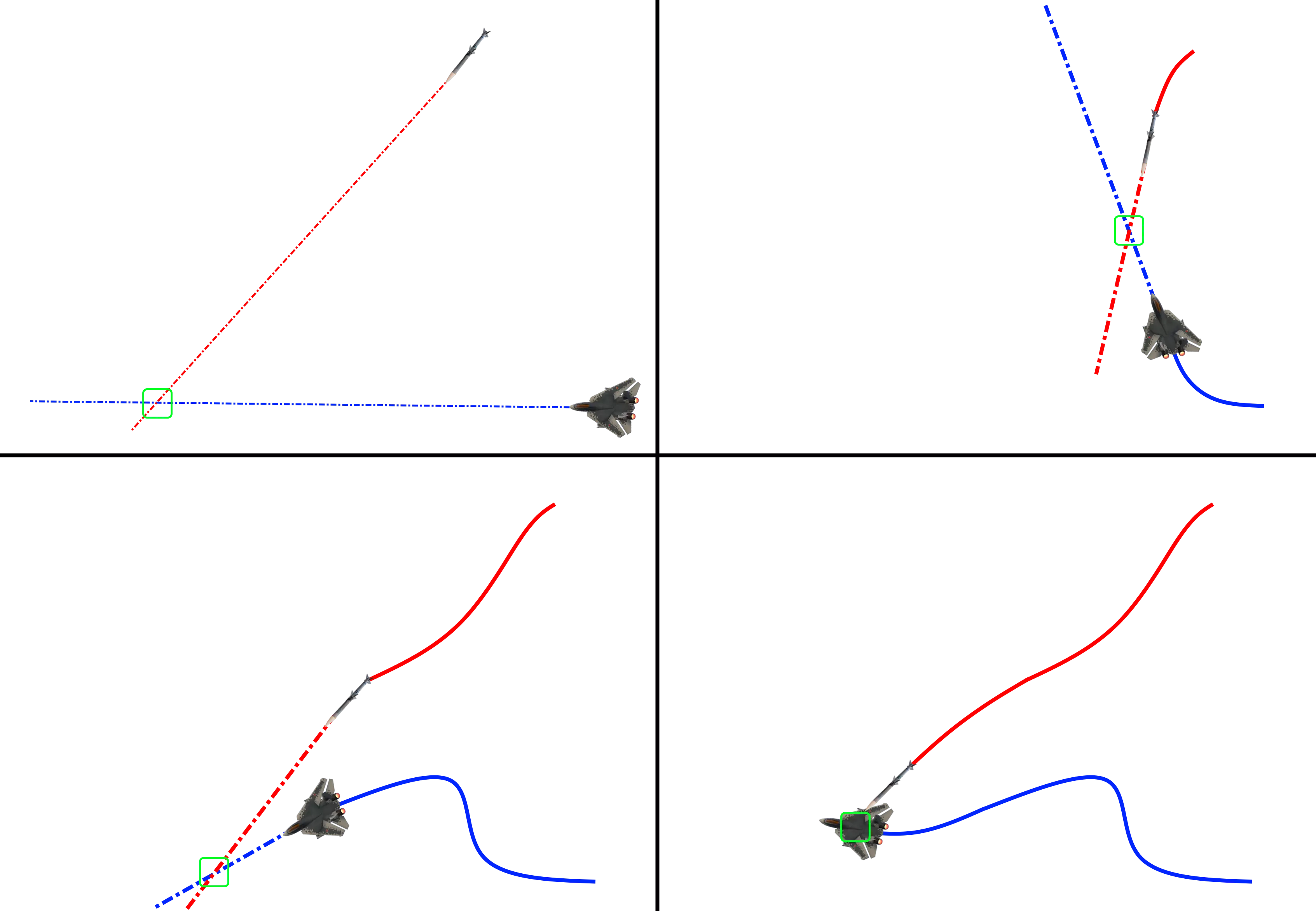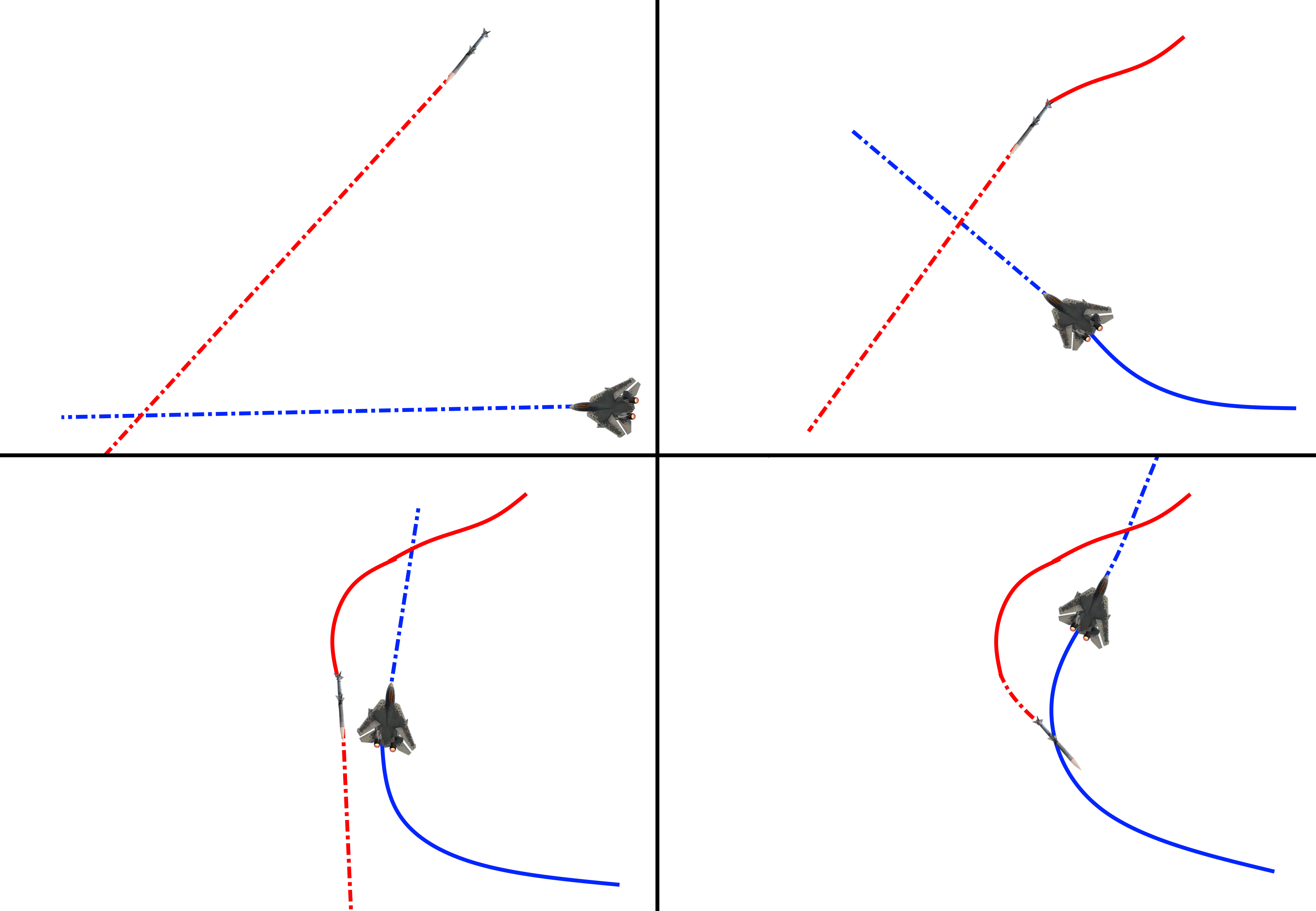 (图片:T-55“泰罗”手册) *使用TSD/TGP生成的瞄准点在计算目标速度方面表现不佳。因此,当使用非雷达制导瞄准点时,务必进行提前量射击。 ADM-160J MALD(微型空射诱饵)【特洛伊】:24型战机配备的诱饵极具威力。一名能够操作诱饵实时战术系统的电子战军官,完全可以让敌人对真实目标的身份和性质产生混淆。它们还能在不使24型战机直接陷入危险的情况下实现对目标的干扰。 在我看来,MALD是单人飞行员在电子战领域竞争的最佳手段。携带数量取决于任务目标,我发现携带2-4枚非常实用。当使用少量诱饵时,我会将它们的巡航位置和高度设置在我认为敌人可能用雷达扫描的区域。这样,敌人雷达信号击中诱饵后就能实现三角定位。如果还有多余的空间,我会让它们开启自动中频噪音干扰,形成一道噪音墙,以便我隐藏其中。 以高速和高海拔发射MALD(微型空射诱饵)是让它们超过8分钟燃料燃烧时间的好方法。在死亡次数较多的比赛中,我最多能在战场上同时部署12个活跃的MALD。不过,你无法控制上一轮 sortie( sortie )中的任何MALD。 MALD也可以设置为SAS干扰模式,但大多数经验丰富的飞行员都能分辨出无人诱饵和真实飞机的区别。SAS功能可用于将导弹从24上引开。如果你能摆脱锁定并部署无人机,导弹似乎会被更强的雷达回波吸引,而这应该就是MALD(微型空射诱饵)。我也曾尝试将24的机腹转向导弹,并部署MALD使其处于来袭导弹和我之间。根据我的经验,以这种方式部署MALD能立即让导弹解除锁定。不过这种技巧可能还需要更多测试。 鉴于MALD在信息战领域的固有特性,其应用仅受你的想象力限制。 战斗飞行机动 - 导弹规避: 导弹是如何工作的?当导弹向你发射时,它会利用你当前的位置和速度来估算需要飞向的命中点。这个导弹认为你最终会到达的点被称为【预计撞击点(PIP)】。导弹会通过飞机的制导系统更新预计撞击点,并调整其飞行轨迹。如果是Fox-1类型的导弹,它会全程使用飞机的制导系统直至命中。如果是Fox-3导弹,则会在撞击前约10秒切换为内置导引头和制导系统(在特定情况下,它可能会延迟到最后一刻才启动主动制导)。 雷达制导导弹为命中预计撞击点而进行的前置量计算示例: