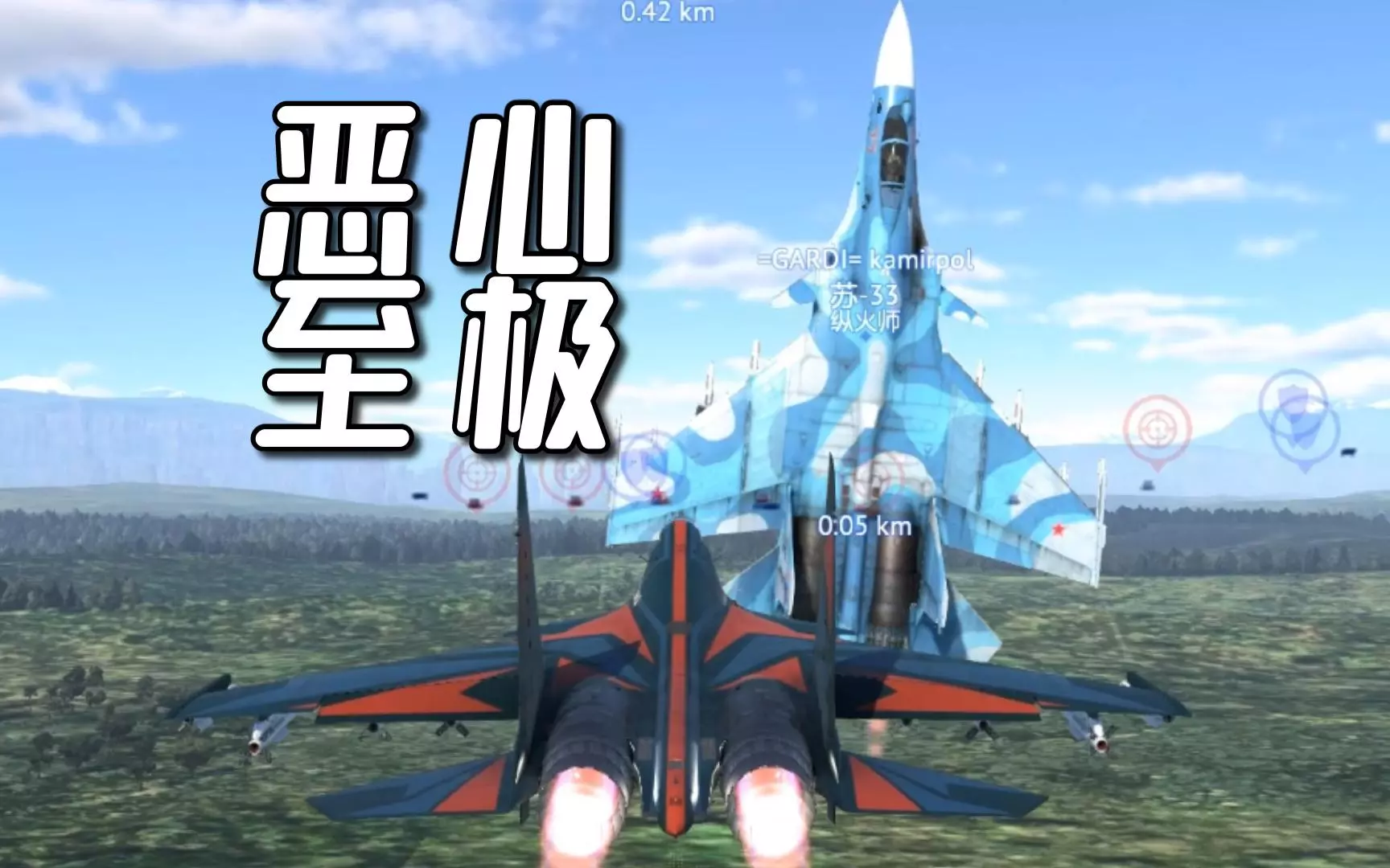 G拉动示例: 进行G拉动时,确保机翼后掠,因为机翼展开时,超过9G的过载会导致机翼断裂。不过调整机翼后掠角或许能让你找到一个最佳位置,从而提升G拉动效果。操作正确的话,即便是最烦人的阿姆拉姆导弹齐射也能躲开。 阿姆拉姆导弹齐射躲避: 在《VTOL VR》中,利用黑视进行G锁定的方式并非人们所想的那样。当你完全视野变红或黑视时,你仍然能完全控制飞机。G锁定效果实际上只是视觉和音频滤镜。这意味着即使在黑视后,你仍可以继续保持拉杆动作。这也意味着,你在昏厥后可以反向拉杆,从而在相反方向产生过载锁定,让你获得短暂的视觉恢复时间。虽然不建议长时间保持拉杆动作,而是应该通过调整转弯间隔来恢复一些体力,但有时你必须这样做以躲避大量阿姆拉姆导弹的攻击。 反向拉杆 有时候你会被后方来袭的导弹锁定。当导弹在足够近的距离发射时,你可能无法有效地进行拖引规避,这时就需要采用反向拉杆的方法。 反向拉杆的时机把握难度要大得多。利用1英里的DAS(简单来说,它会自动探测所有视线范围内的目标),你可以更稳定地掌握拉杆时机。将战术态势显示器(TSD)完全放大,当导弹出现在圆圈内时,你就进行拉杆操作。我发现提前将方向舵调整到位会让这变得更容易。如果你进入的滚转角度太小,导弹就不需要转足够的弯;如果滚转角度太大,你就无法及时拉出足够的过载。这里有一个需要花时间去掌握的最佳区间。 战斗飞行机动 - 冲向交汇点: 空战机动或交汇:24型战机能够与其他飞机进行速率格斗。尽管这并非24型的专长。当你发现自己即将进入交汇时,将机翼设为前掠位置并放下襟翼。交汇速度为280-320节,速率格斗通常发生在300节左右。对于在何时何地进行交汇要非常谨慎,因为一次糟糕的交汇会让你丧命。 (注意:与45型战机交汇总是很棘手,因为它可以进行VIFF(前飞矢量控制)并切入你的转弯半径内侧。)在狗斗中,24号机很可能在失速时失控,因此务必保持对飞机的控制。熟能生巧,一定要花些时间习惯24号机在低速状态下的飞行特性。 如果陷入不利局面,24号机可以选择脱离战斗,但如果对手仍有热寻导弹,你会后悔逃跑的。如果决定在接战后脱离,首先需要有障碍物挡在你和追击者之间。你在规避来袭炮火时会损失大量能量,所以他们跟在你身后的时间会比你想象的长得多。如果想在未能取胜的情况下脱离接战,最重要的是需要队友的协助。如果你正努力争取进入缠斗阶段,可能需要花些时间练习从超音速转换到缠斗速度的操作。低头调整机翼后掠角和襟翼可能会给敌人可乘之机。未能为战斗做好准备可能会让你在进入缠斗时陷入不利局面。提前规划战斗有助于在紧张情况下保持一切顺利进行。 缠斗的艺术往往在于能够解读敌机的动向。在1v1大厅中花时间练习驾驶55或26进行缠斗,能够培养可迁移到24上的技能和习惯。 如果你想了解更多关于24的基础战斗机动的深入信息,强烈推荐罗西的24 PvP指南,该指南可在本指南底部的参考列表中找到。合并示例1: 合并示例2: 通用策略与建议: 速度与高度:EF-24最常见的玩法是发挥其最大优势:高速与高空飞行。当飞行高度超过30000英尺海拔时,空气会变得足够稀薄,使你能轻松突破2马赫。但需注意,飞行高度的软限制为75000英尺海拔。在这些极端高度和速度下,你的武器系统射程往往能远超DLZ(下图所示)上显示的距离。