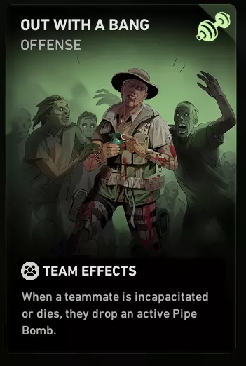 11) 自爆离场 当有玩家倒地时,如果在关键时刻有燃烧瓶掉落在他附近,这意味着至少有一名玩家的牌组中携带了【自爆离场】,这无疑暴露了其平庸的构筑,并彰显出他是新手。 绝对不要携带这张卡牌。如果在战役中抽到它,直接无视。这是一张会大幅增加游戏难度的糟糕卡牌,原因很简单:掉落的燃烧瓶会吸引大量僵尸聚集到倒地玩家周围,阻碍队友对其进行救援。这张卡牌和【虚张声势】【施虐者】【守望】【受伤野兽】【天生飞人】一样愚蠢且无用。这些卡牌都不符合GIG-BIMD原则,完全可以忽略它们的存在。