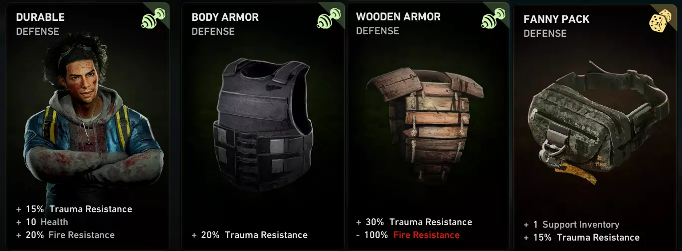 10)创伤抗性 让我们回到我们的坦克角色。他怎么了?他受到伤害了吗?看看他的生命值。如果在受到普通僵尸的伤害后,他的生命值条变红了三分之一,甚至更多——那他显然是个新手。这个坦克角色承受了10次攻击吗?看看受伤状态——如果在这样“猛烈的打击”后,生命值损失超过10%或更多——那么沃克很快就得为自己的团队成员资格辩护了。 在坦克角色去“NH”之前,确保你的卡组中包含“摩托车头盔”、“ padded suit”、“Durable”、“Body armor”、“Wooden armor”,并且不要忘记“Fanny pack”。总之,所有能为你提供伤害防护的卡牌都应该在你的卡组里。PVE就是一个持续积累伤害的过程。在扮演坦克角色时,你越是能抵抗这些伤害的累积,生存时间就越长。