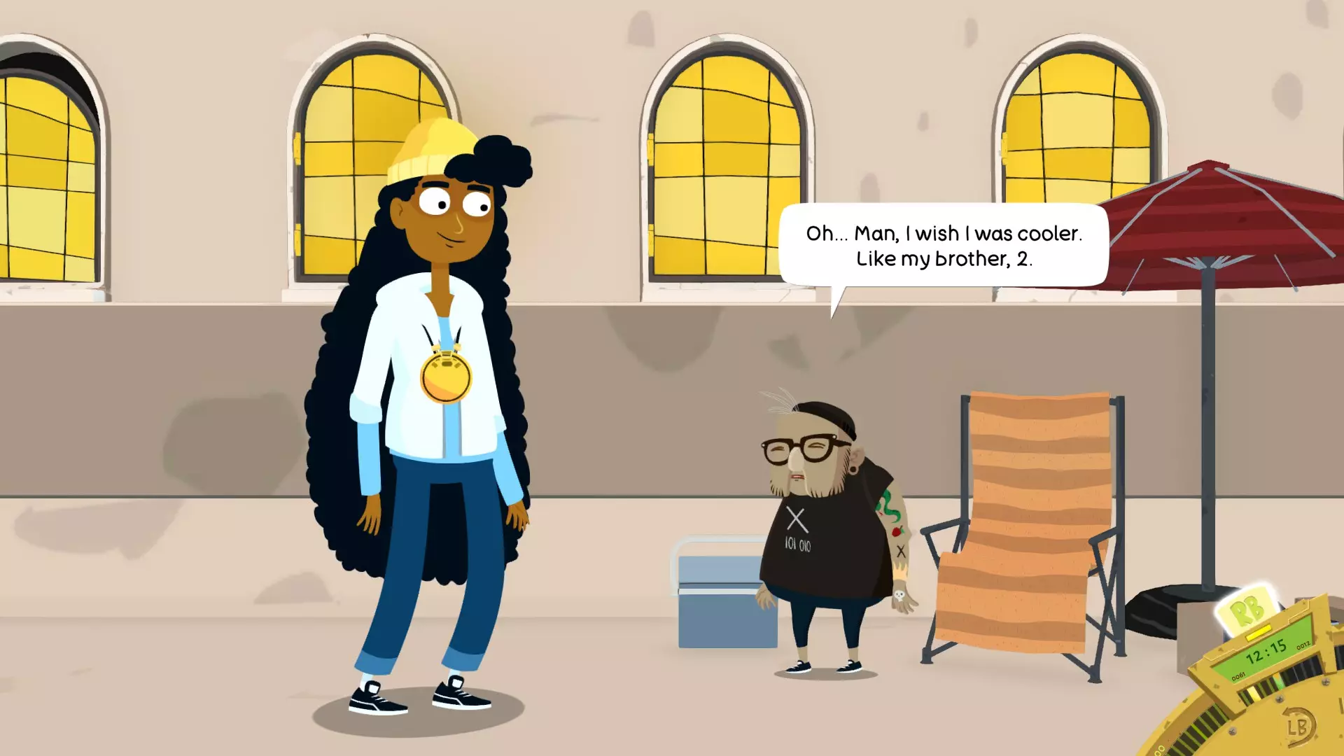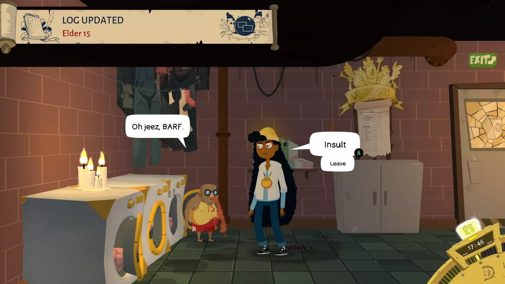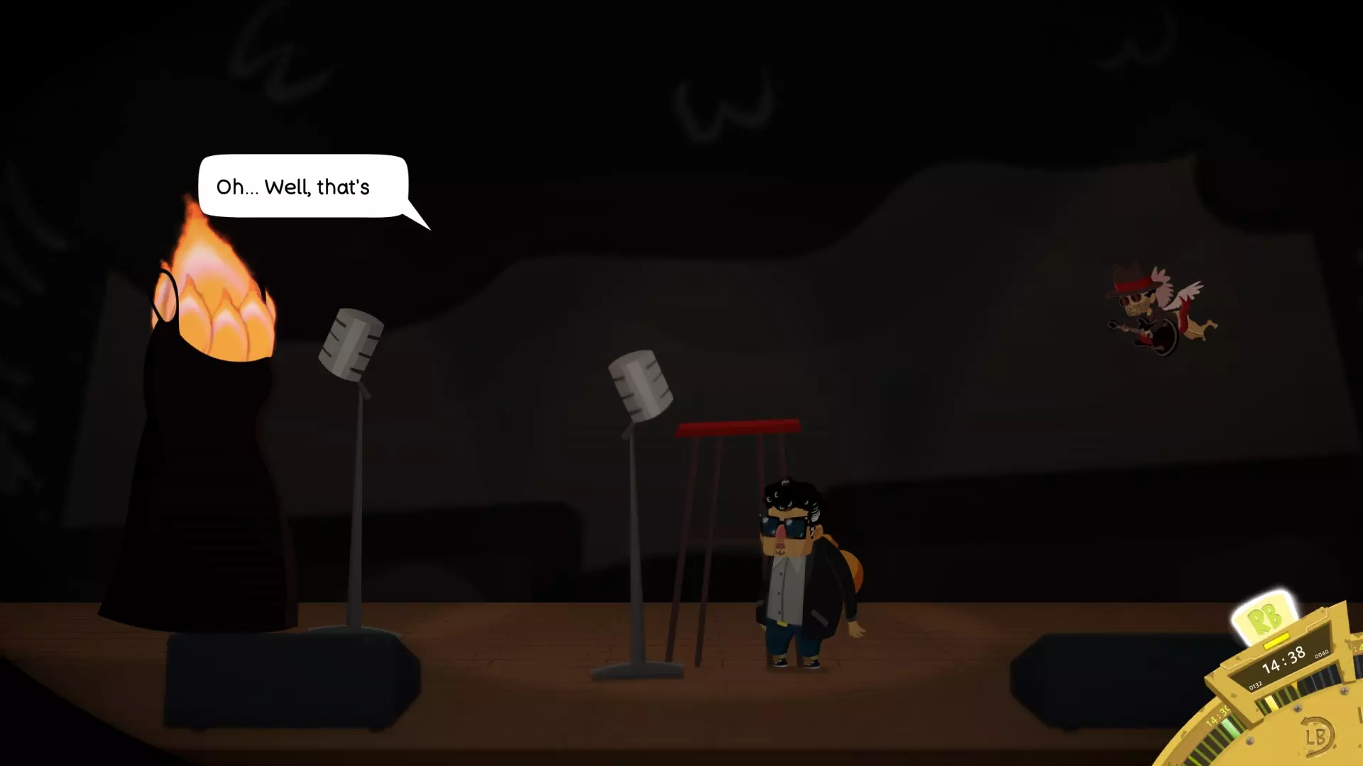 我认为你只能在跟踪戴夫之后才能找到他(我找不到正确的房间)。沿着有14号长老海报的小巷往下走,然后向右拐,你会找到他的舞台。你需要一些物品。从13号那里获得的门票(仅首次进入时需要),以及从桌游区获得的扩音器(25个筹码)。观看表演,在歌曲接近尾声时,他会开始轻声唱歌。这时你就用扩音器侮辱他。 15号长老