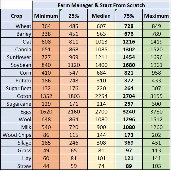 已收集的数据包括每种作物的收获产量、平均售价以及由此产生的每英亩利润。 简介 注意:本指南最后更新于一年多以前。自那以后,游戏更新可能已发生一些变化,以下内容可能未反映这些变化。但它仍能帮助你理解游戏系统,并对价格有一个大致的了解。 我已收集了基础游戏中每种作物每英亩的升数数据。本测试是在所有作物产量为165%的情况下进行的。 至于售价,我在游戏文件中找到了一些数据,我认为这些数据代表了各个销售点的平均价格。你可以利用这些信息确保自己总能以合适的价格出售作物。价格会受难度等级影响,具体倍数分别为:【新农夫】难度3倍,【农场经理】难度2倍,【白手起家】难度2倍(自1.2补丁起)。不过存在一些例外情况,比如沼气厂的青贮饲料、 manure(粪肥)和 slurry(泥浆)价格似乎是“硬编码”设定,它们不遵循游戏文件中的设置,且不受你在该处销售产品的影响。数据收集与结果 作物 每英亩产量(升) 每千升售价(新农夫难度) 每千升售价(农场经理及从零开始难度) 每英亩售价(新农夫难度) 每英亩售价(农场经理及从零开始难度) 备注 小麦 7,118 1,011 674 14,069 9,379 总金额包含秸秆销售价格 大麦 7,630 939 626 14,037 9,358 总金额包含秸秆销售价格 燕麦 4,530 1,689 1,126 14,523 9,682 总金额包含秸秆销售价格 秸秆 55,872 123 82 6,872 4,582 油菜 4,637 1,809 1,206 8,388 5,592 大豆 3,574 2,334 1,556 8,342 5,561 玉米 7,344 1,140 760 8,372 5,581 向日葵 4,176 2,019 1,346 8,431 5,621 甜菜 46,247 366 244 16,926 11,284 需要特殊机器且收获时间更长 土豆 32,763 516 344 16,905 11,270 需要特殊机器且收获时间更长 棉花 3,969 3,756 2,504 14,908 9,939 需要销售价格 为了帮助你等待最佳的销售时机,以下是你可以预期的价格范围。目标销售价格应在75%和最高价格列之间。 作物/产品 | 75%价格 | 最高价格 ---|---|--- 棉花(需要专用收割机和特殊拖车) | 72,924 | 357,238 甘蔗(需要专用机器且收获时间更长) | 26,034 | 17,356 牧草 | 17,382 | 135,902 玉米/青贮饲料(需要专用机器且必须购买沼气厂土地) | 347 | 1,564 青贮饲料(裹包) | 51,489 | 60,036 谷仓价格 | 25,745 | 25,745 牛奶 | 17,382 | 513,342 羊毛 | 8,917 | 5,944 木片 | 1,500 | 1,000 鸡蛋 | 1,800 | 1,200 manure | 240 | 160 slurry(必须购买沼气厂土地) | 4,500 | 3,000 (必须购买沼气厂土地) | 600 | 360 (必须购买沼气厂土地) | 479 | 287