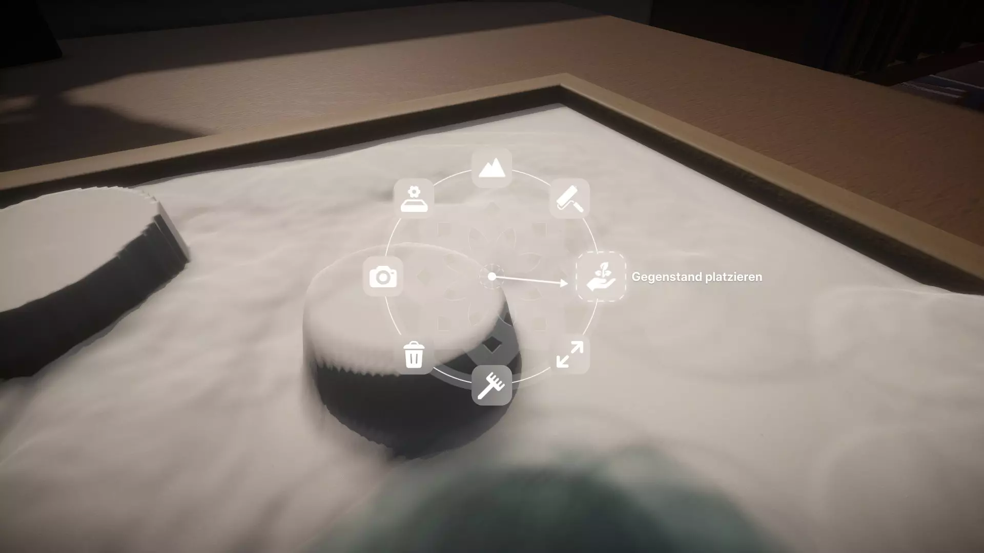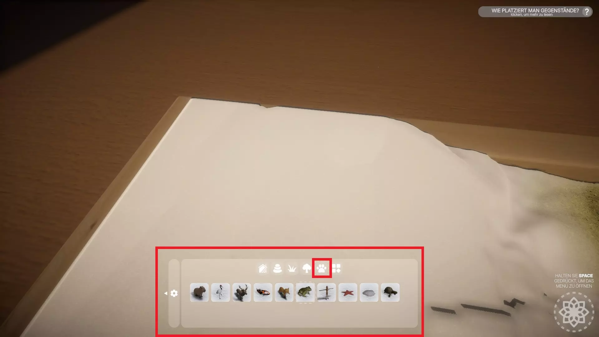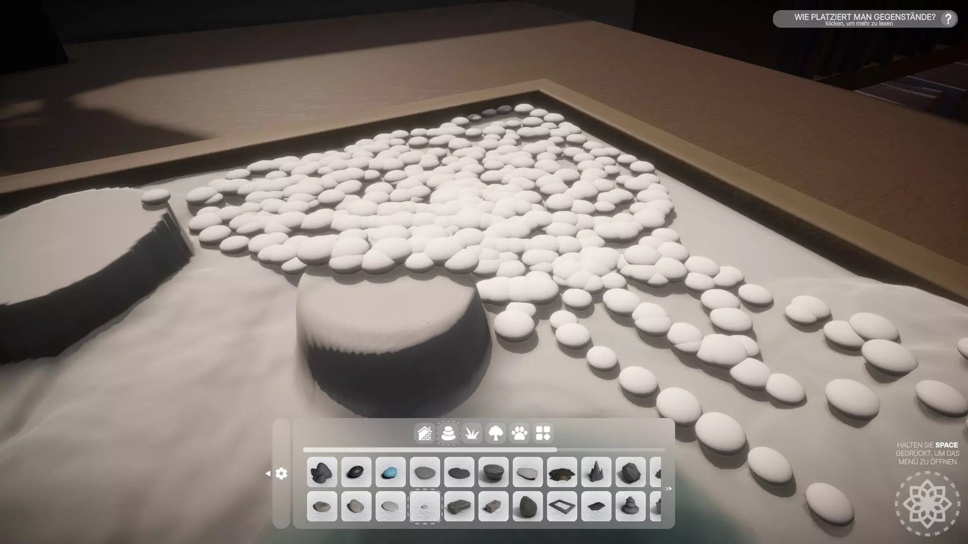 - 放置10个物品 按住空格键打开建造菜单,选择放置物品。现在只需在花园中放置10个物品——我推荐小石子