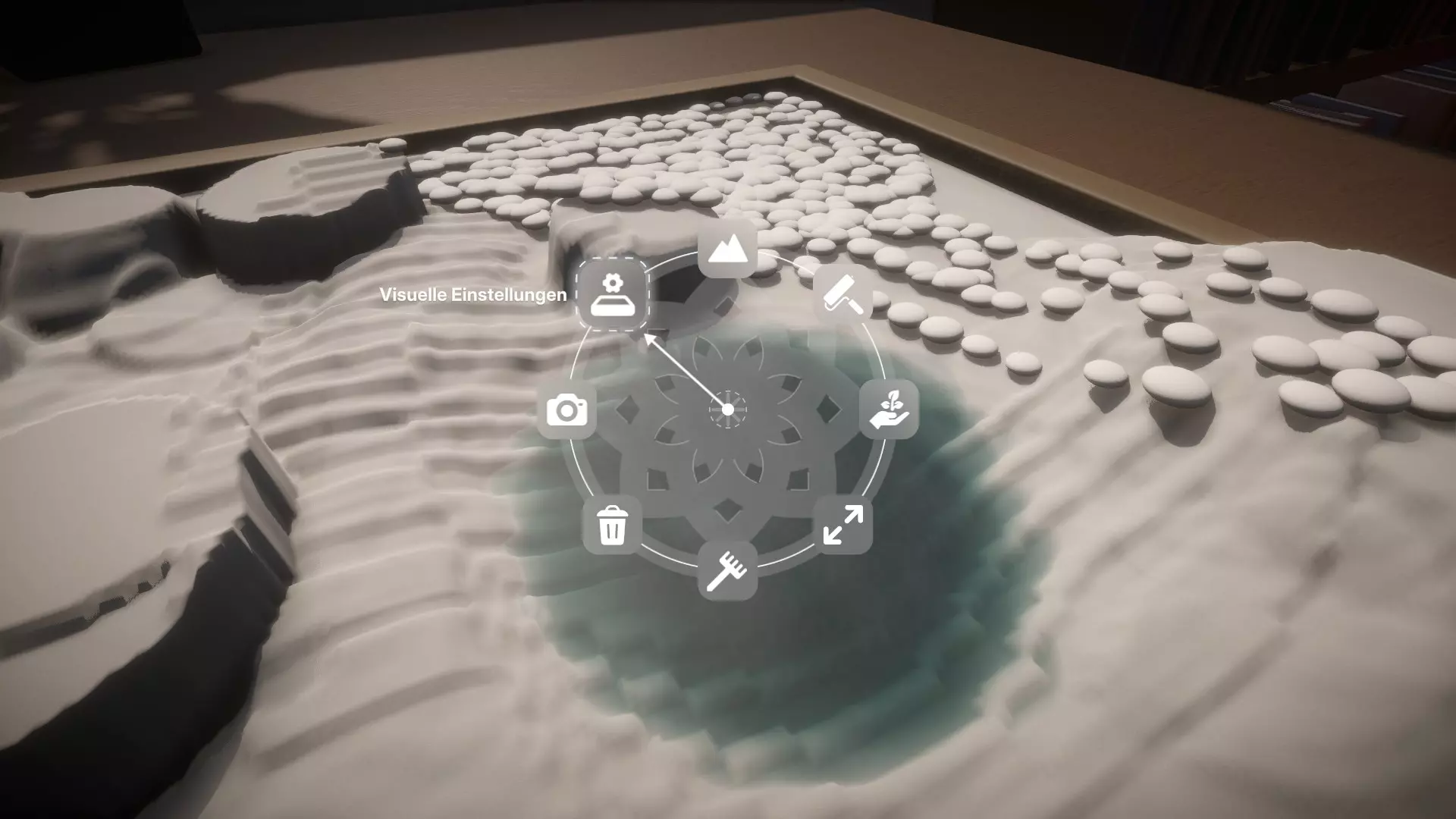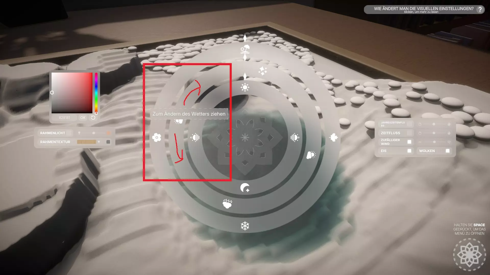 - 更改天气 按住空格键打开建造菜单,然后选择视觉设置。按住鼠标左键将中间的圆圈向上或向下拖动。