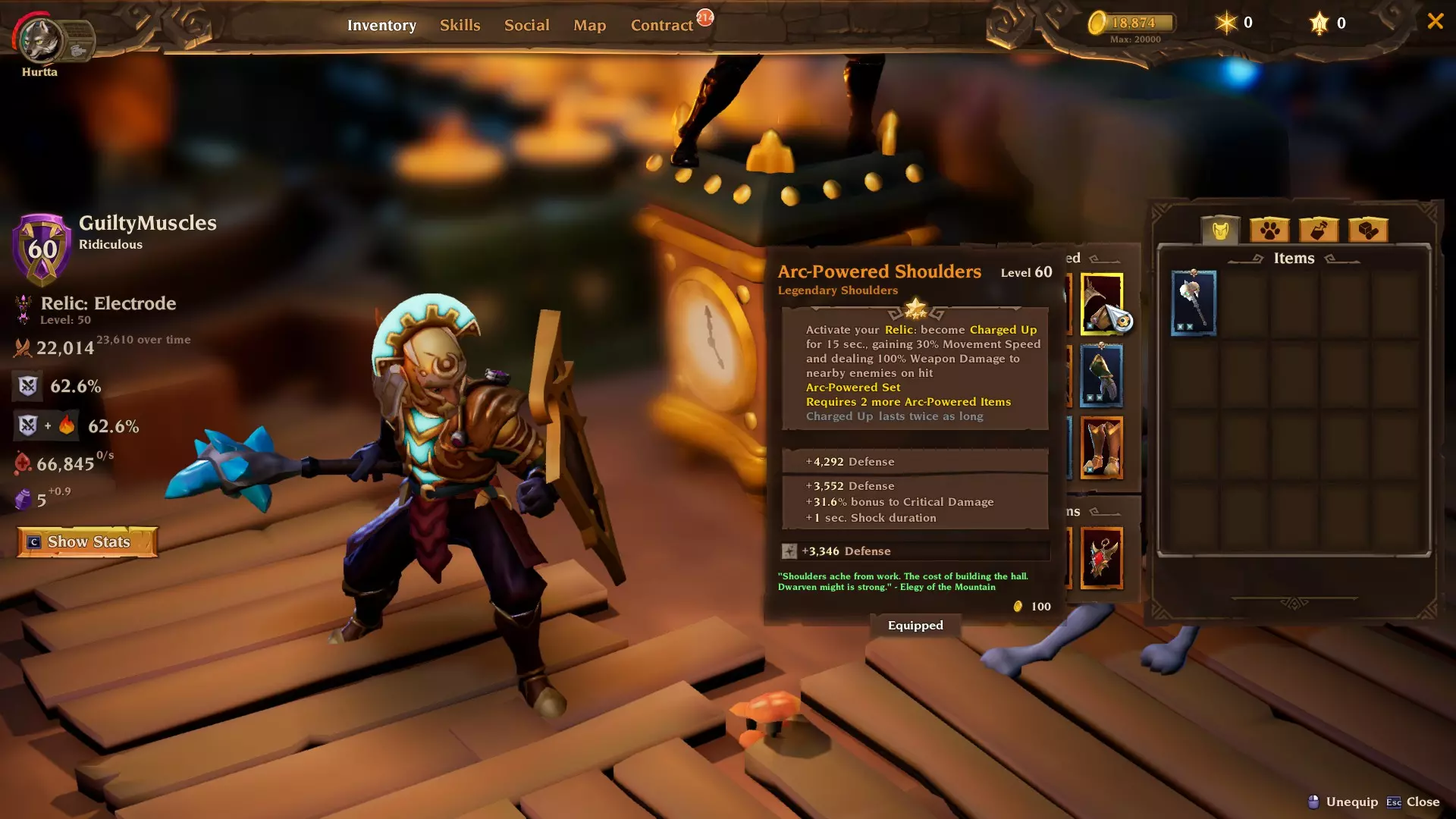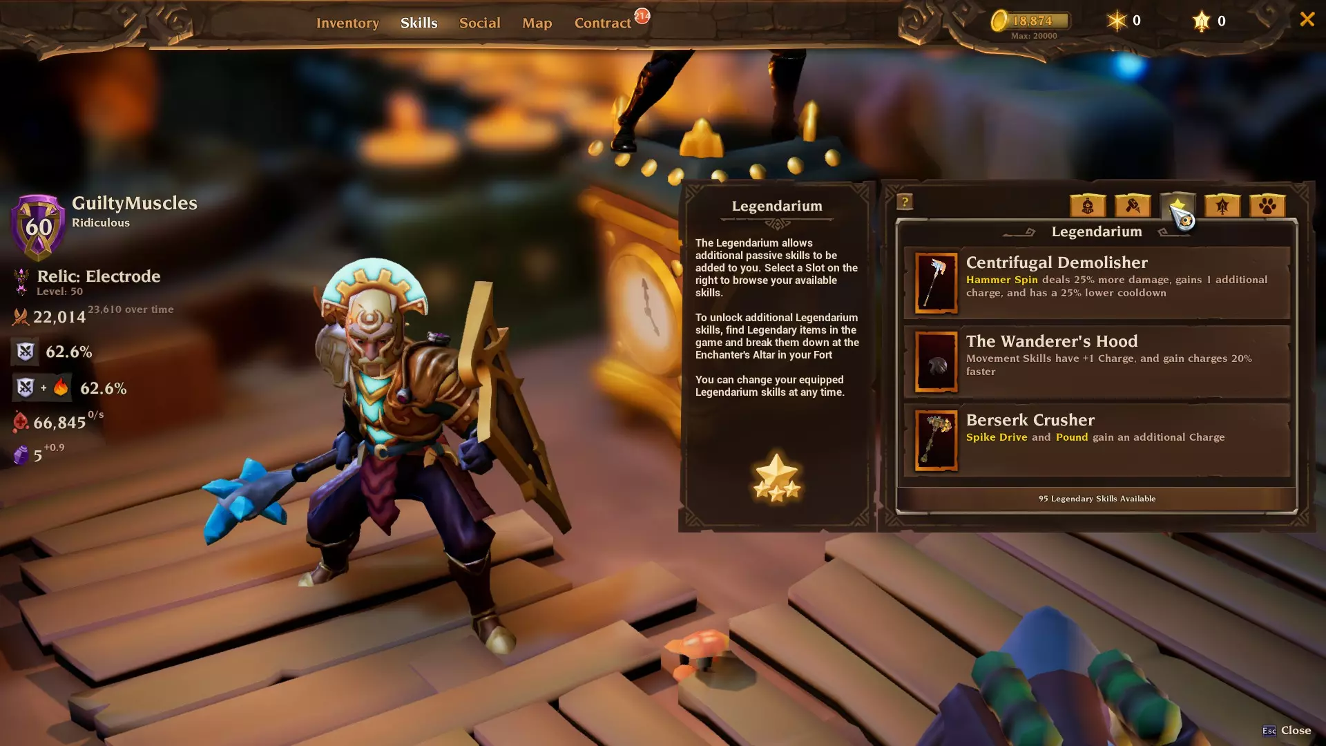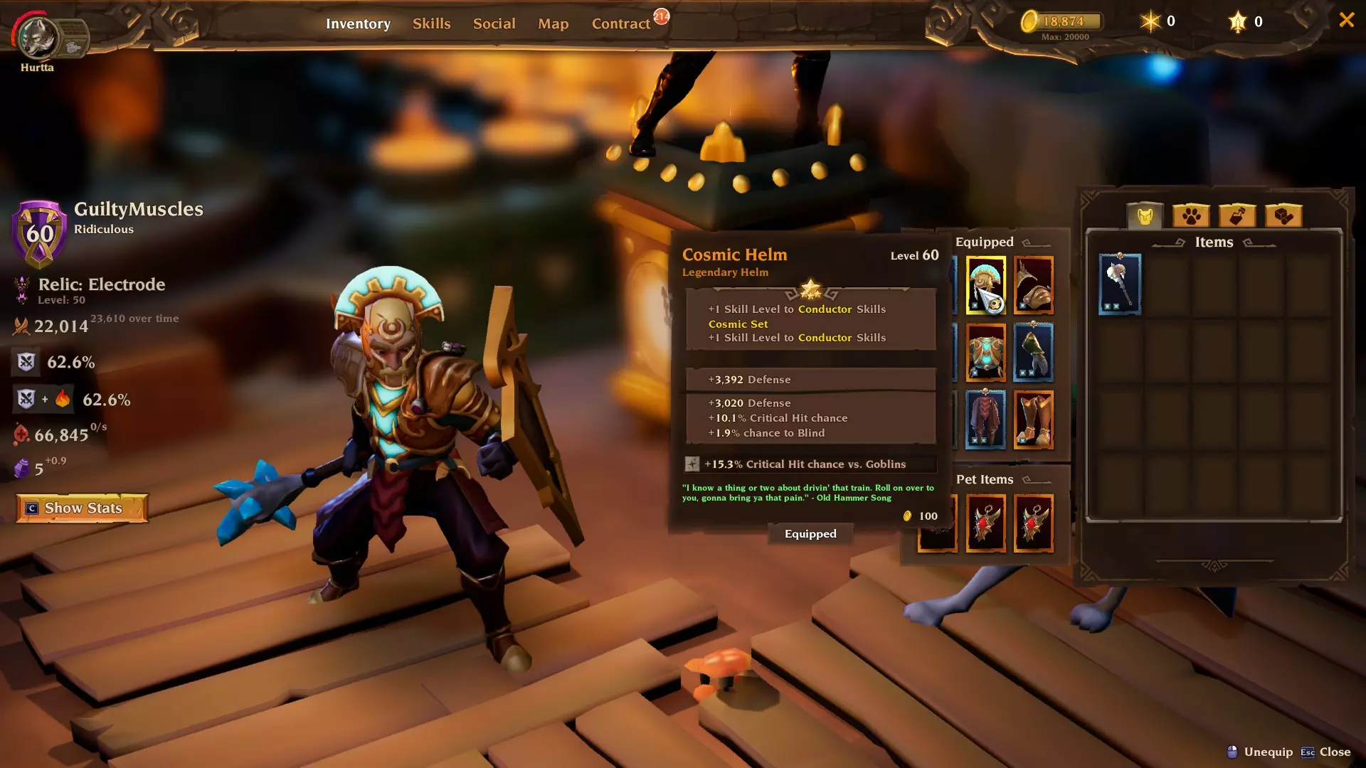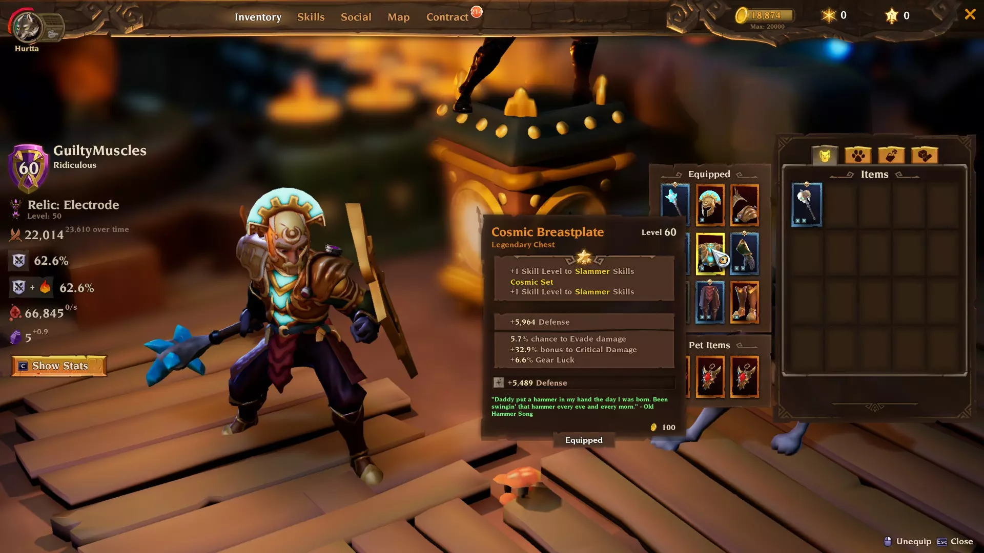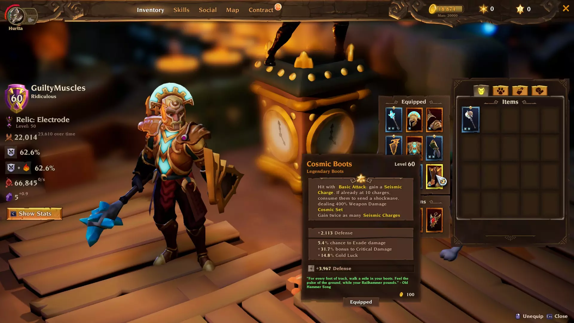 飞行镐:火车会降低我们的耐力恢复。这个被动技能提供25%耐力恢复加成,以抵消或至少减轻该惩罚。换句话说,它能提升我们的每秒伤害。虽非必需,但强烈推荐。如果你觉得不需要这个,扭矩挥击的【对粉碎者技能+10%暴击率】被动可能是不错的替代选择。 配装 以下是配装情况。如你所见,我们使用宇宙头盔和胸甲来获取额外属性点。
