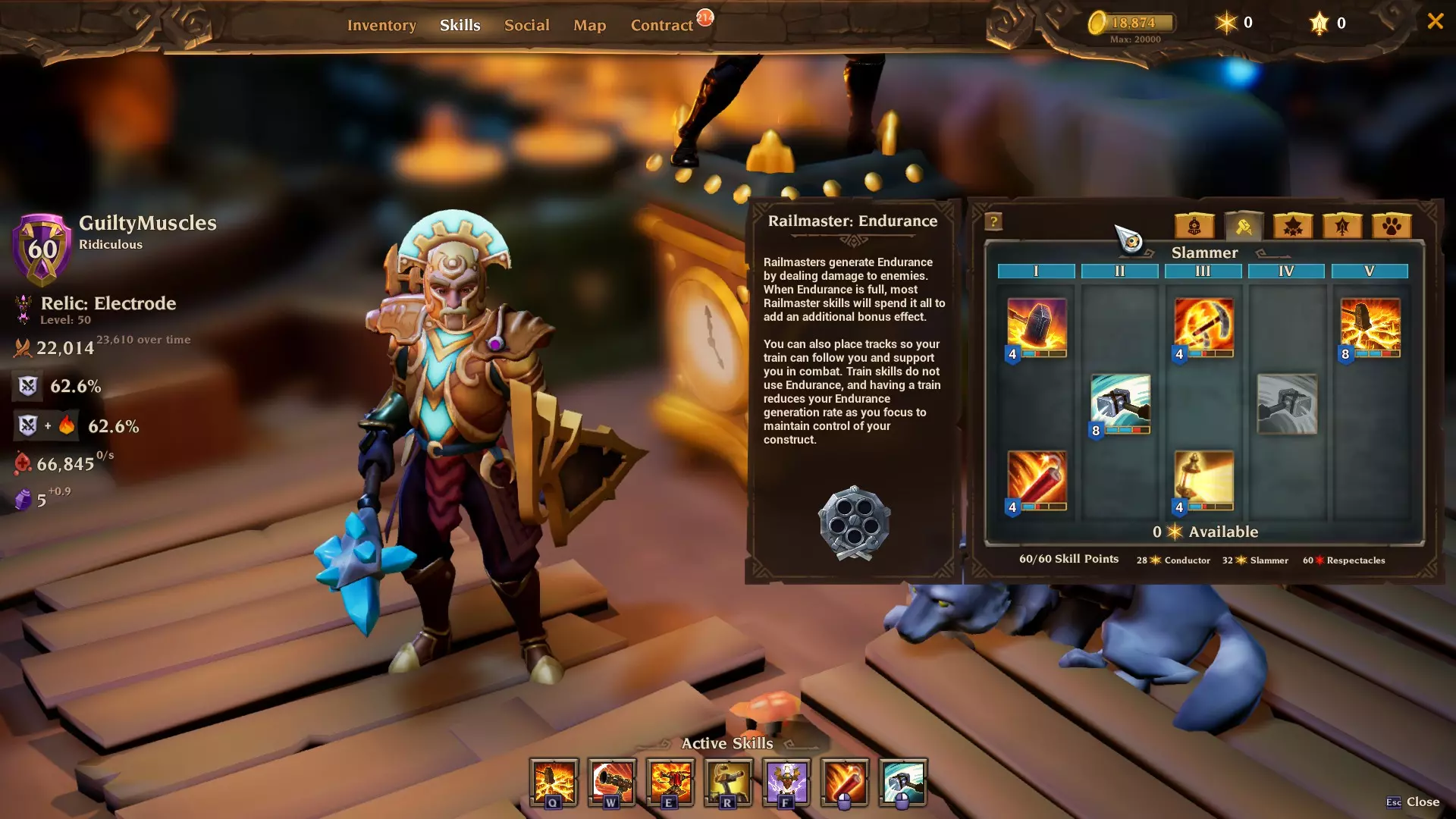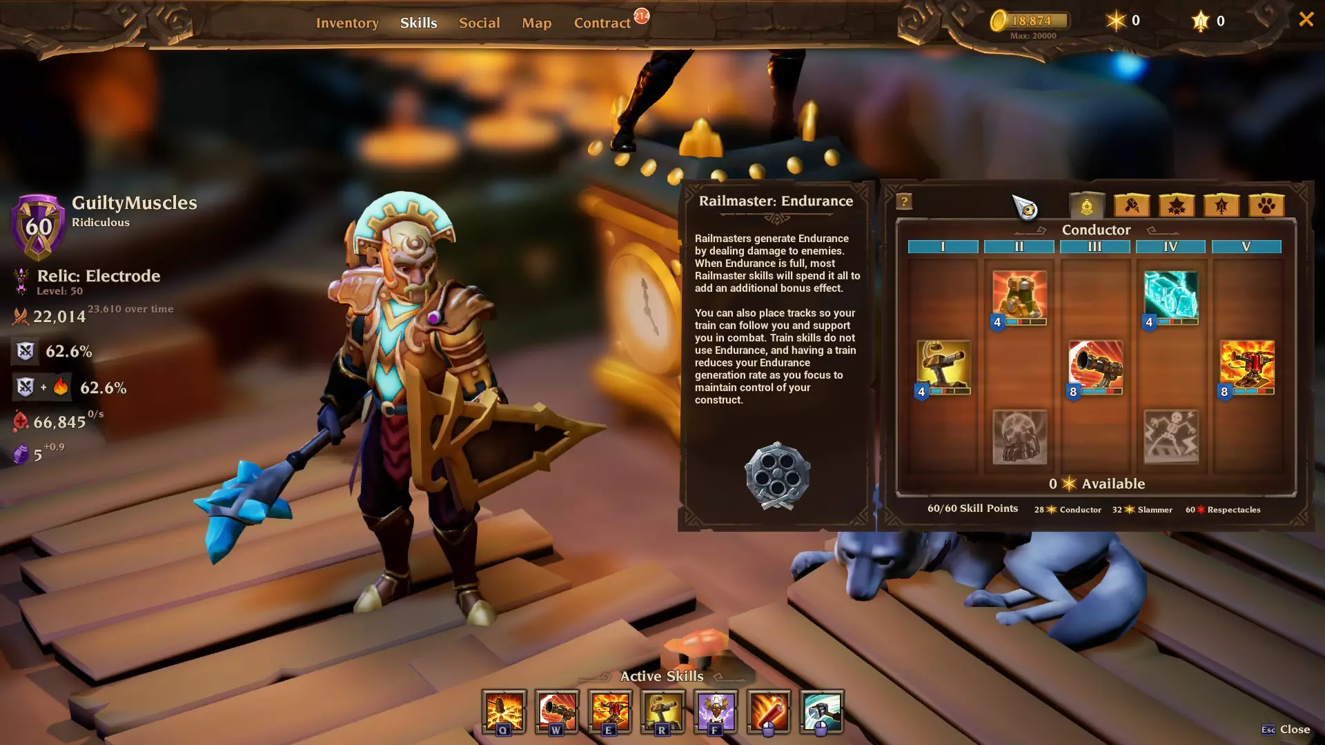 爆破充能:提升自身45%所有伤害,包括火车的被动攻击和遗物主动技能。是在火焰喷射车和霰弹枪车处于冷却状态时消耗耐力的优秀技能。该远程技能可触发【战士之魂】 buff,获得50%伤害减免。爆破充能的第二层加成能将【战士之魂】的伤害减免效果从50%提升至70%。我发现不带传说arium时效果更佳。
