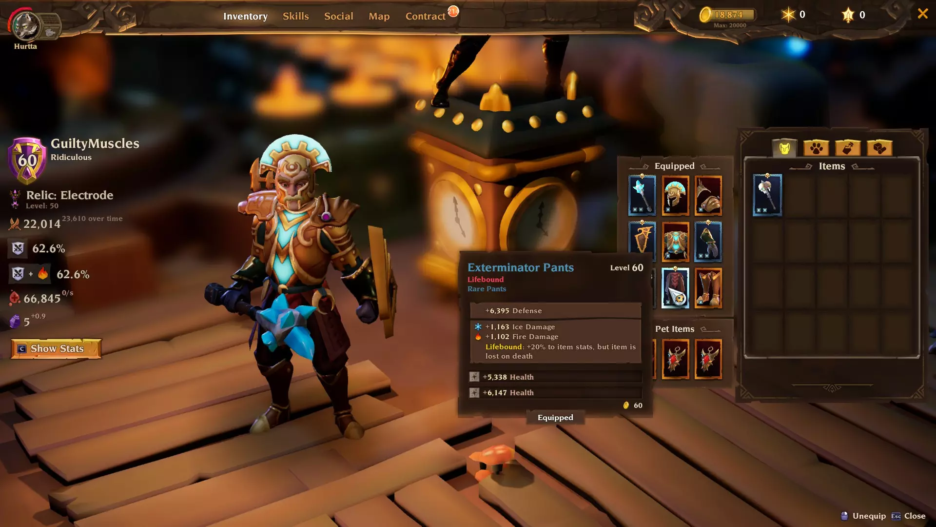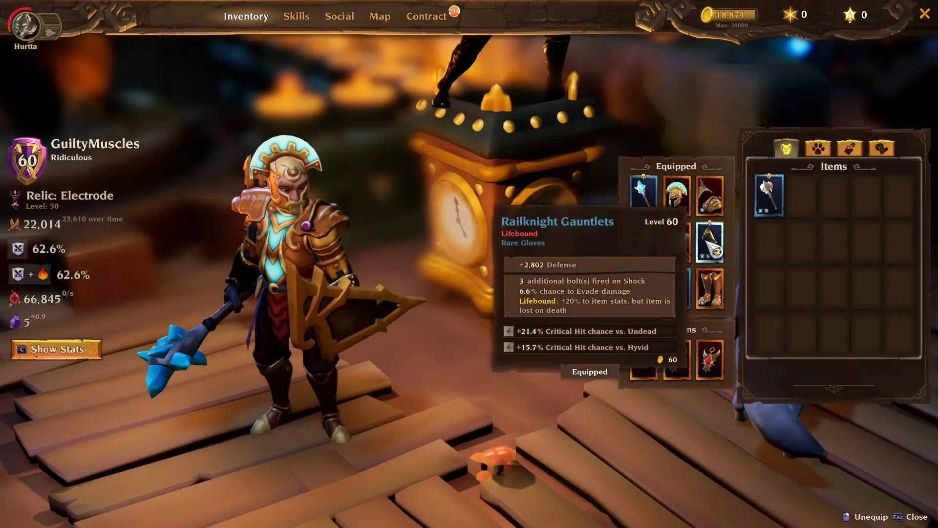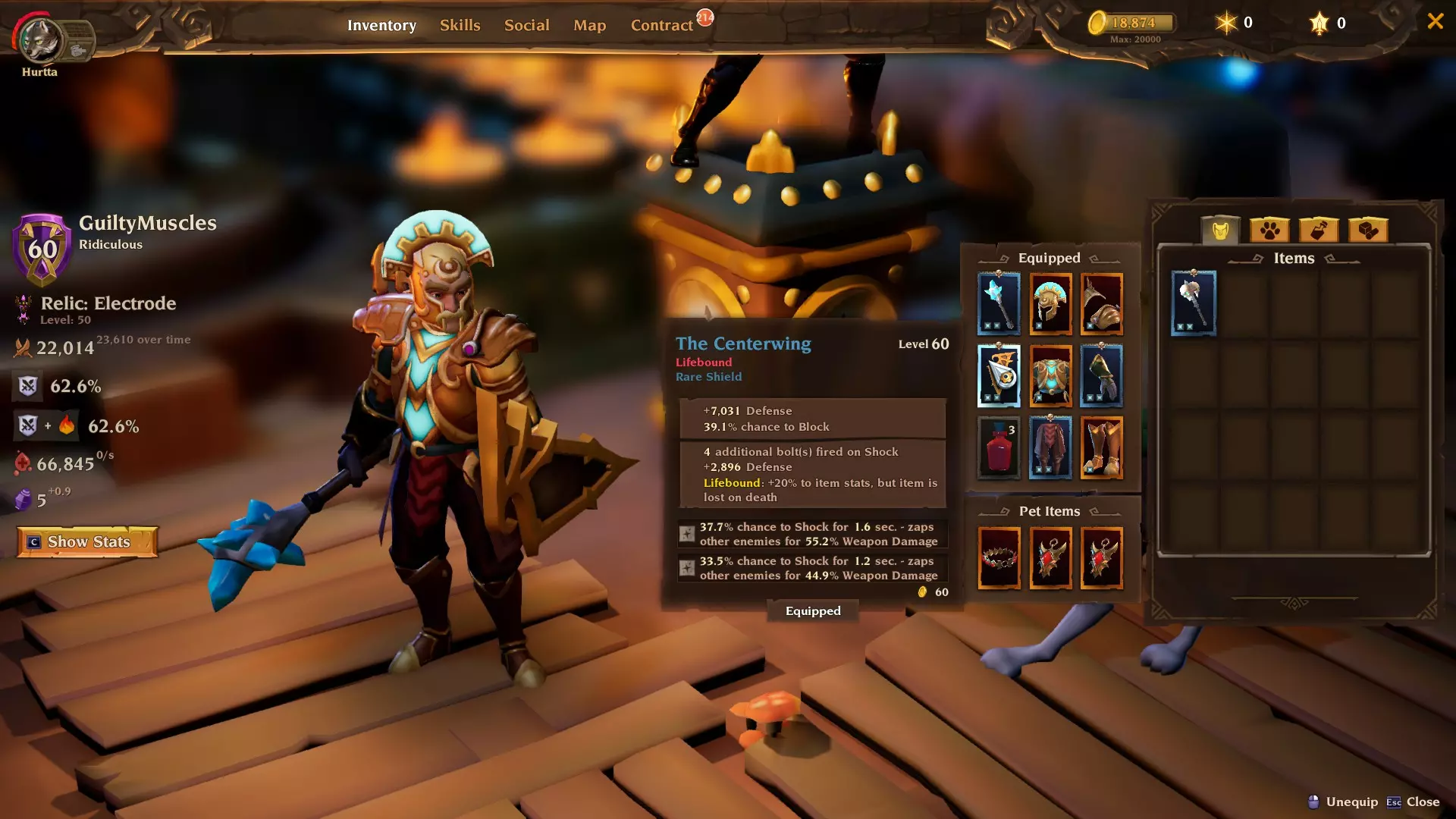 物品 以下是我使用过的所有物品截图。我会根据不同情况切换两把武器。死亡骨杖(Deathbone Scepter)用于普通楼层,因为它有较高的冻结几率,这还能触发特定的破冰者楼层 buff,额外增加25%暴击率。由于 Boss 无法被冻结,所以我会用仪式终曲(Ritual Finale)对付它们(只要我记得的话)。因为我使用盾牌,所以避免武器带有电击百分比。盾牌的电击百分比已经足够让所有敌人一直处于被电击状态,这能触发我们的遗物效果和特定的带电线圈楼层 buff,额外增加25%暴击率。 除非你有元素伤害百分比加成属性,否则武器的元素类型无关紧要。 我强烈建议所有物品都绑定生命(Lifebound)。20%的属性提升听起来可能“不值得”,但这20%可能会救你一命。这次跑图我差点死了十几次,但【生命绑定】物品足够保命。记得如果不幸死亡的话,要准备一些备用装备。我就留了【宇宙套装】的其他部件和【霰弹枪手之盾】以防万一。 这个build伤害太高了,我觉得完全没必要堆叠持续伤害。不过我很幸运地给宠物弄到了流血和中毒属性,这些属性触发了特定楼层的加成,让我们获得了25%的暴击率。