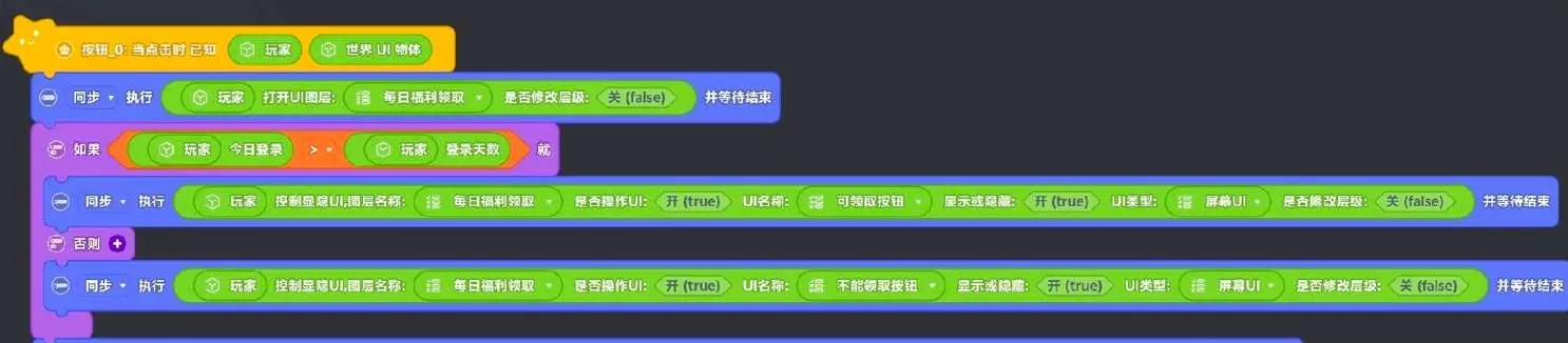 4. 【每日登录领取界面】的领取奖励按钮,当点击时添加积木脚本,内容如下