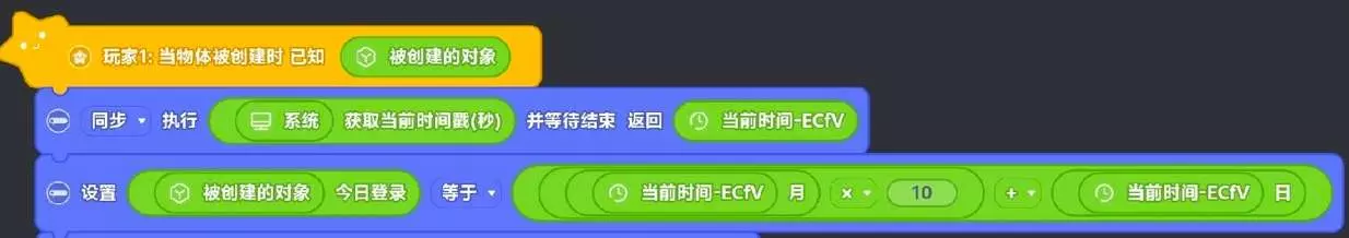 第2行:设置最开始添加的玩家数据【登录天数】,把这条数据的值修改为:当前时间(月)*10+当前时间(日),例如今天是4月8号,最终值就是48,用法如第2大步的第2行积木说明
