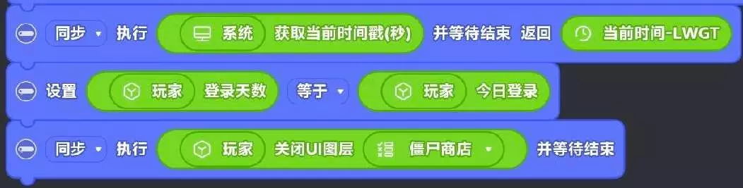 (小小说明下,在第2大步的玩家角色创建时的积木中,我们设置了【今日登录】数据的值=48,而没有设置【登录天数】的值,所以功能做好刚上的时候玩家就可以领取)