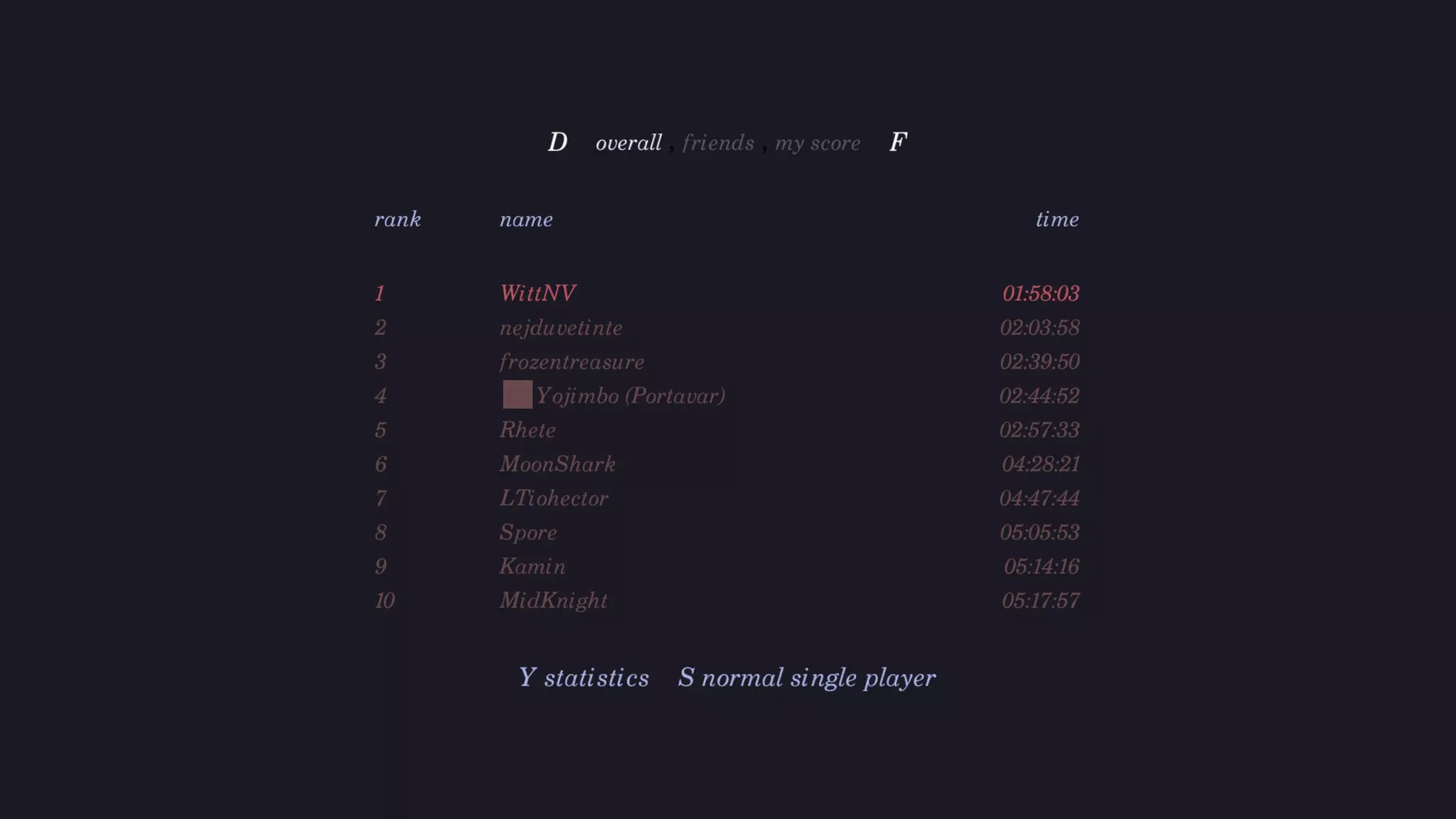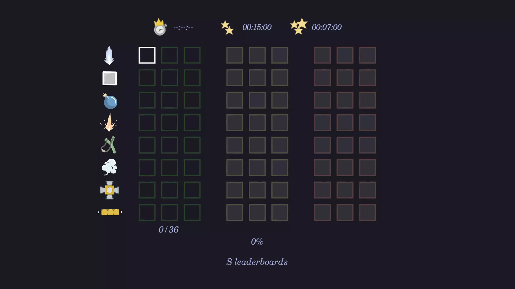 挑战房间是需要你在最短时间内完成的关卡。这些房间颇具挑战性,你需要熟练掌握当前使用的工具才能完成。 工具将由游戏本身进行介绍,随着游戏的推进,你会逐渐习惯它们。每个工具设有9个挑战房间:3个无时间限制,3个限时15秒,3个限时7秒。尽量争取更短的时间,因为游戏最终会将你的分数提交到排行榜。 排行榜是存储玩家完成时间的地方。你可以使用D键和F键在全球排行榜、好友排行榜和个人分数之间切换。同时按下S键可在单人模式和合作模式之间切换,跳跃键(默认:Z)会显示所选用户的统计数据。