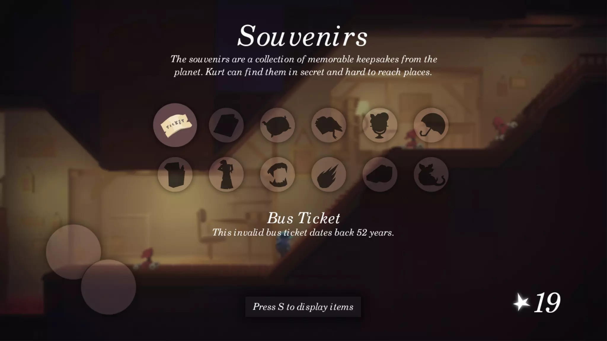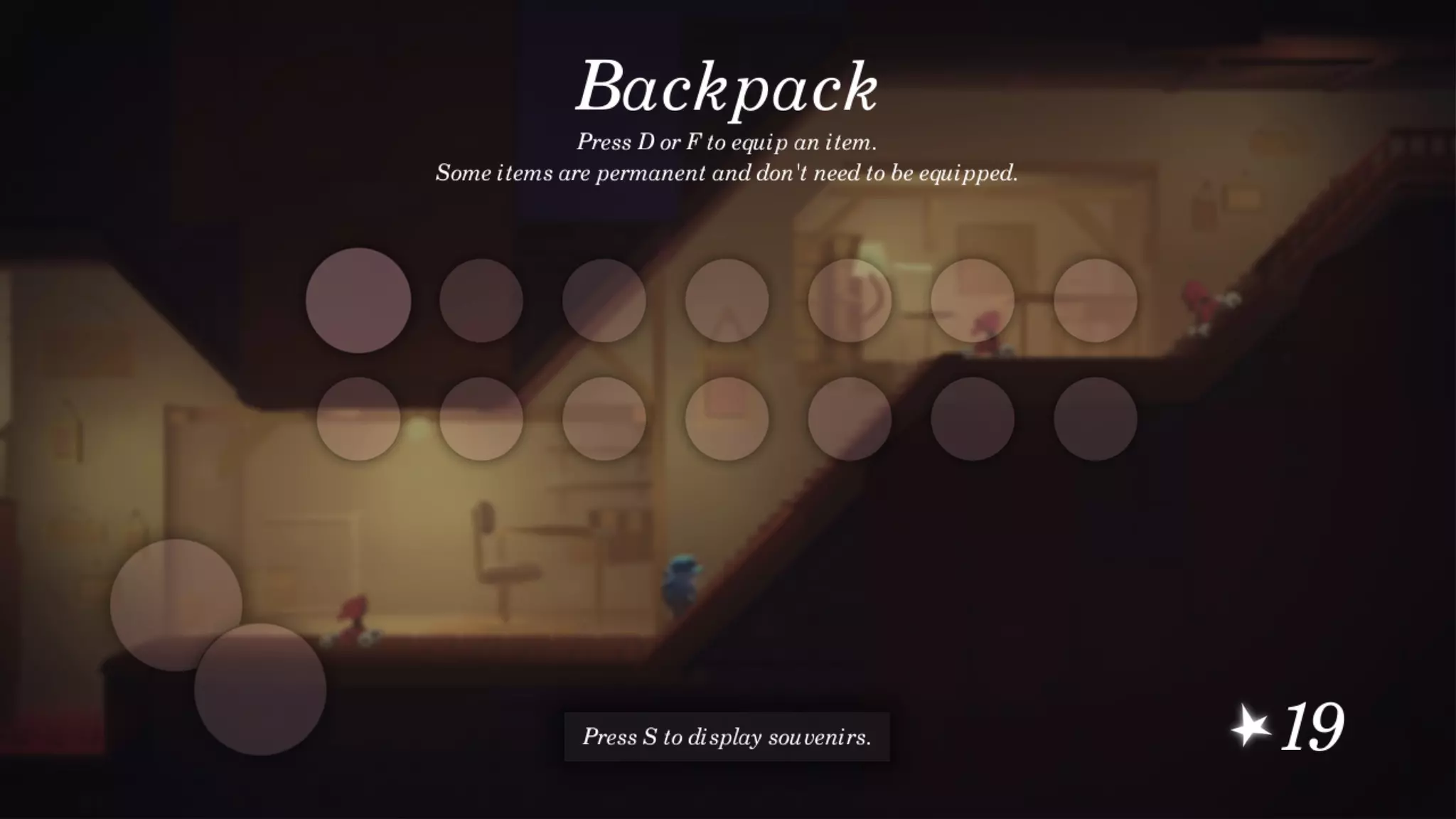 在屏幕左下角,你会看到两个空白槽位,用于从背包中添加物品。若未更改按键设置,左侧槽位使用D键分配,右侧槽位使用F键分配。注意,这些按键同时也用于使用对应物品。 按下纪念品键(默认:S键)将显示你的纪念品,这些纪念品可在秘密地点找到。这些地点大多是你通常不会注意到或认为空无一物的地方。