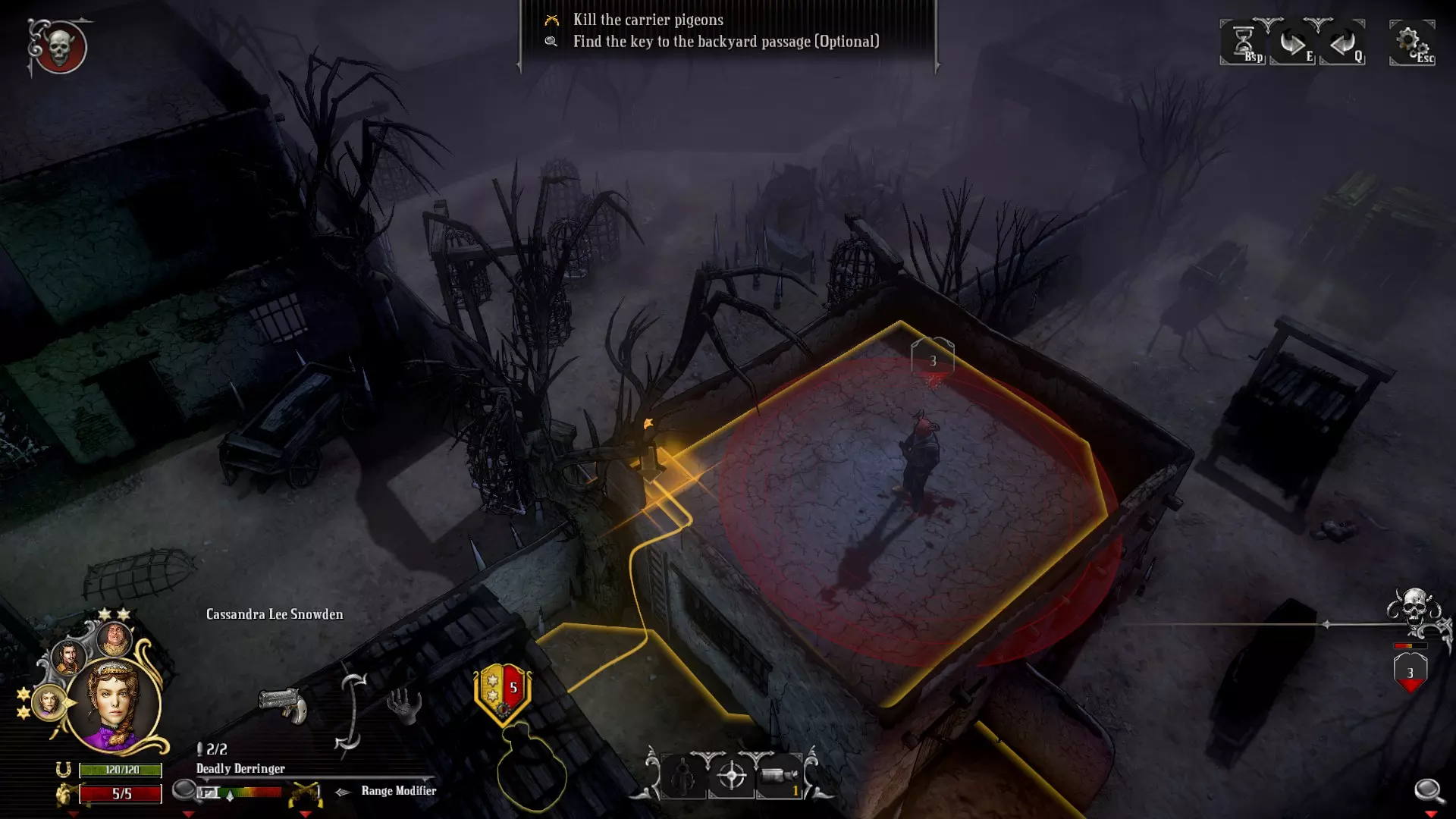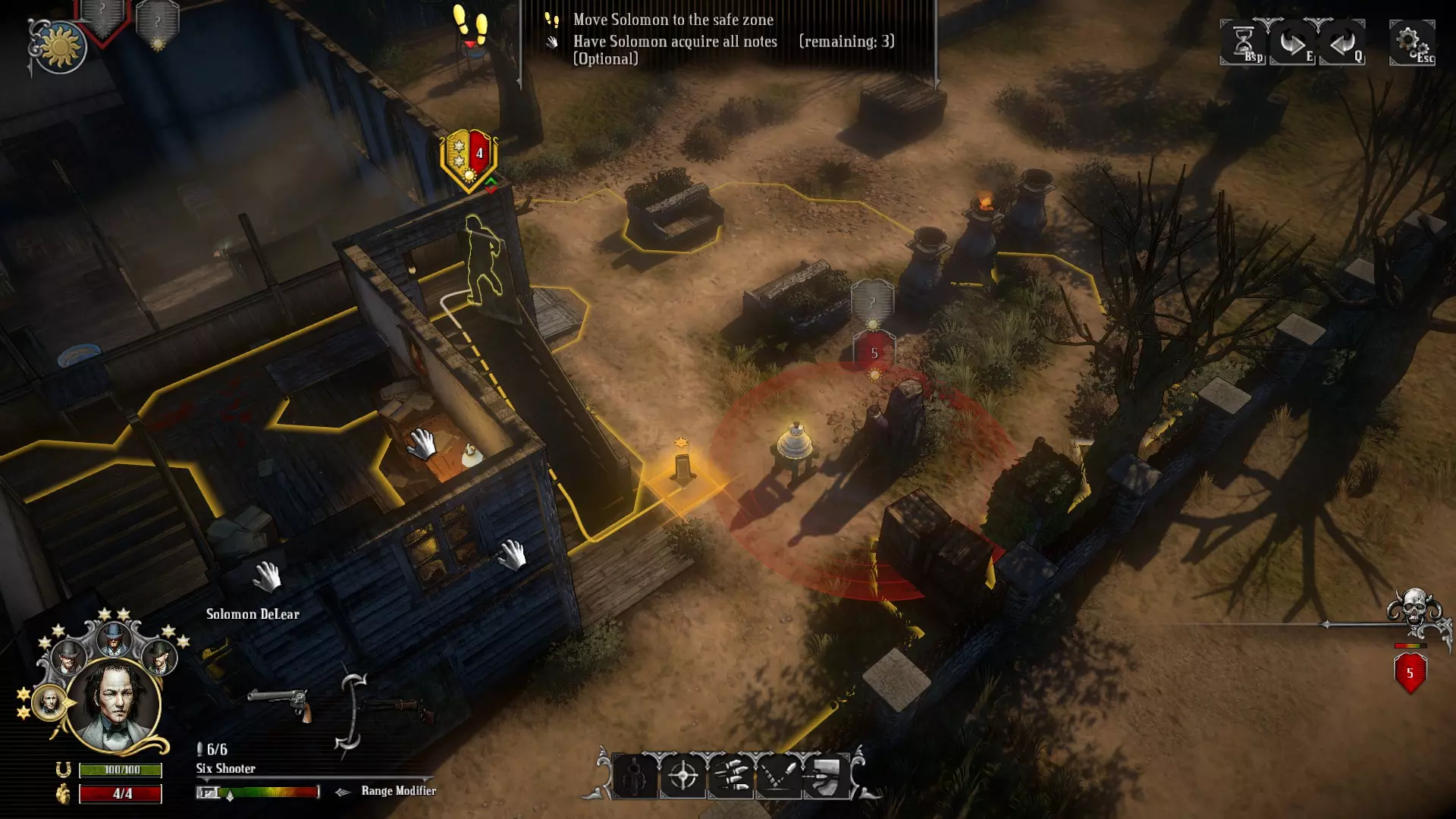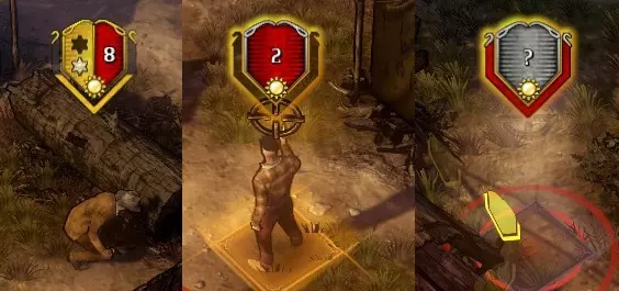 从左到右依次是玩家角色、视野内敌人、视野外敌人的图像。 星星代表行动点,数字代表生命值,下方的太阳图标在处于阳光下时为黄色,处于阴影中时为黑色。 外侧呈V形的边框代表掩护状态。此图中从左到右依次是半掩护、无掩护、全掩护。 图标颜色与视野的关系如下: 敌人图标为红色→处于行动角色的视野内。 敌人图标为银色→未处于行动角色的视野内。 若处于视野内,则可以看到该敌人的生命值。如果敌人的生命值显示为银色,说明除当前行动角色外,还有其他角色能看到该敌人(即共享视野)。 通常情况下,若无法看到敌人的身体或影子,就无法进行射击。但通过视野共享,即便当前行动角色什么都看不见,也能进行射击。了解这一点有时会很有用。 难度差异(以下仅为已确认内容,以普通难度为基准): 简单难度: - 敌人生命值-1 - 敌人数量减少 困难难度: - 敌人生命值+1 - 敌人数量增加 - 部分门或闸门会关闭,无法通行 参考:开发者的投稿《Hard West》中存在一些独特且强大的物品,当满足游戏内特定条件时即可获取或解锁。解锁后,这些物品会在剧情选择界面中以治安官徽章的形式显示,并且可以在其他剧情的命运商人(Fate Trader)处购买。在《Hard West》里,能够对不同剧情产生影响的要素主要就是这些(当然还有其他一些)。命运商人的机制 在剧情的第一个任务之后,基本随时都可以前往 不持有现金 每件物品的库存各为1个,但每完成一个任务就会重新进货 (由于会大幅改变平衡,通常游玩时不推荐)购买后进行存档并读档会重新进货 其他细节 最后用条目列出一些小机制 按R键可以重新装填(不知为何直到主线剧情结束都没发现……) 世界地图和死神的消息可以按空格键跳过 楼梯移动为3格距离。不过隔着台阶的话就不会是直射。 当上层的敌人紧贴窗户时,有时可以从正下方或相邻格子进行无掩护直射攻击。 这种位置关系如下: 设置阶段的射击不会因掩护而减少伤害(防御方处于站立状态,未利用掩护)。 处于相邻状态时(显示为adjacent),即使中间有掩护,也不会因掩护而减少伤害。 即使在直射距离内,如果不相邻,仍会因掩护而减少伤害(这点需要注意!)第一次压制会将热度值(而非叠加)设定为该数值,因此怀疑计数器有时会缩短。 怀疑计数器的上限为5或7,是由任务决定的吗? 处于暗影斗篷的隐身状态下进行射击会显形,但之后让其他角色行动会重新进入隐身状态。 即使是铁人模式,战斗中返回标题菜单并重新加载,实际上也可以重新开始。