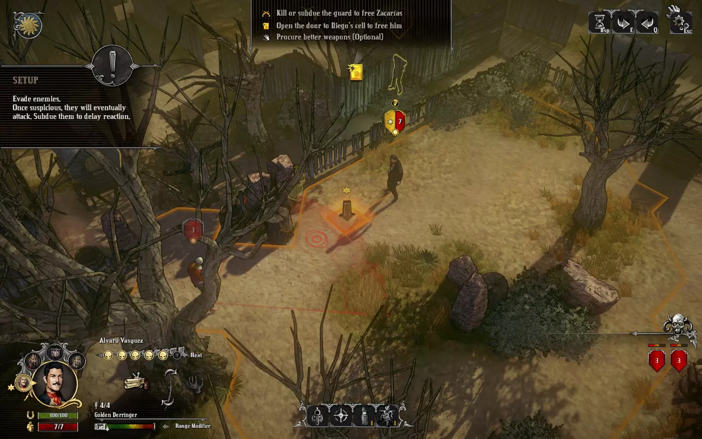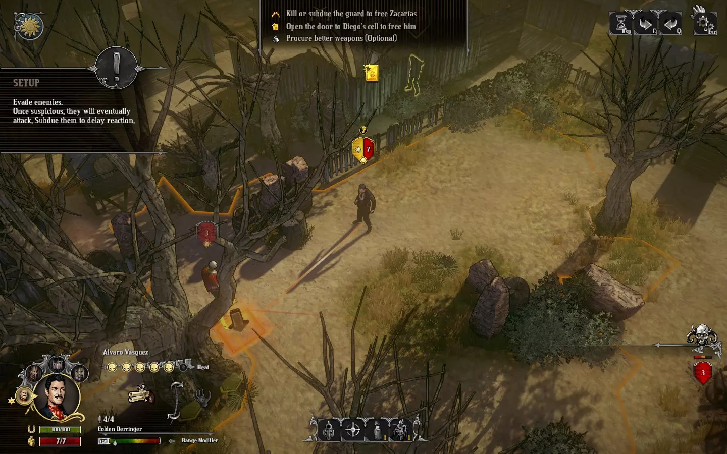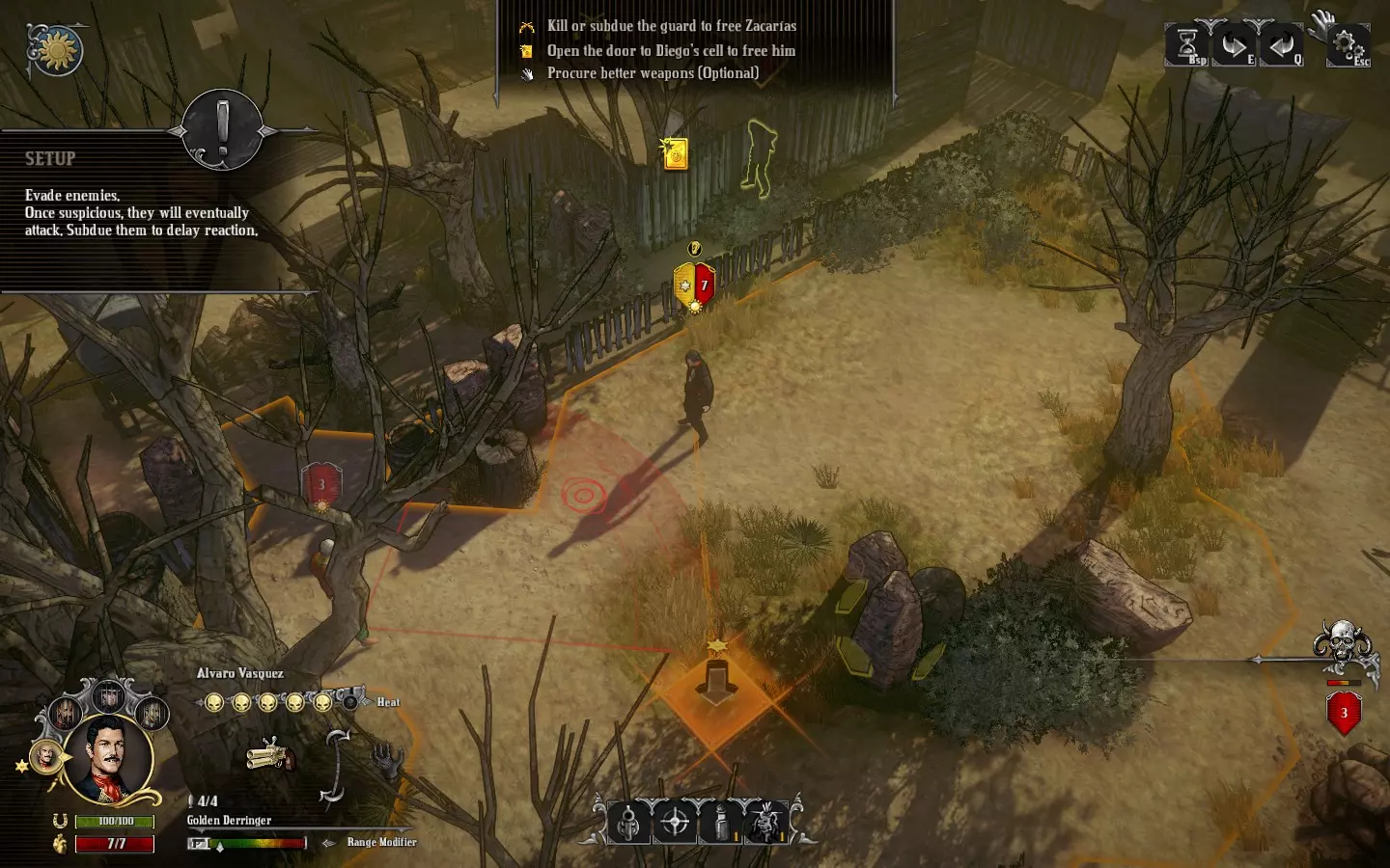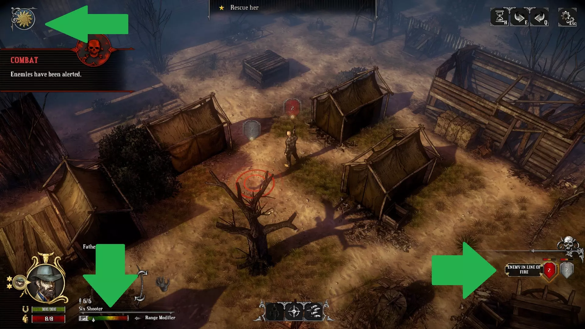 为了享受《铁血西部》的舒适游戏生活。 关于命中判定、反应射击、直射、视野范围、战术画面、图标、难度、命运商人等内容。 前言 本指南将介绍游戏内教程和手册中未详细说明的规则与机制。即使不了解这里的内容,也能顺利通关所有剧情,但了解这些后,你将能更轻松愉快地游玩随机性较低的《铁血西部》。 内容基于2017年7月1日的最新版本v1.5进行确认。如果有错误或难以理解的地方,欢迎通过评论告知。 关于术语,只将那些翻译成日语后更容易理解的部分进行了翻译,其他则未翻译,直接用片假名或英语表示。 经常出现的“point-blank shot”简记为“直射”,请留意这一点。 命中判定 命中率(Chance to Hit)以%显示,但在《铁血西部》中,与一般的回合制策略游戏不同,它并非概率。射击是否命中,是由射击方的命中率和防御方的运气(Luck)预先决定的。简单来说,判定机制是“若攻击方的命中率大于防御方的运气值,则命中;否则,用运气值减去命中率”。 关于命中判定的随机性,仅存在于任务开始时决定的敌人运气初始值。因此,与这类游戏通常情况不同,会经常出现能够确定下一次射击必定命中的局面。这种随机性要素较少的机制是《西部狂徒》的最大特征。 命中率的计算首先是将以下要素进行简单的加减法运算。这一点可以从射击确认界面中查看。射击方角色 + 角色瞄准值 + 高度 +10%(从下方射击时可能为负值?) - 无视野 -10% 枪械 +/- 精准度加成 +/- 距离 防御方角色 - 防御力 - 半掩蔽状态 -20% - 全掩蔽状态 -30% 当上述计算结果过高或过低时,将应用以下修正: 1. 若上述计算结果为80%及以上,最终命中率为100% 2. 若上述计算结果为20%及以下,最终命中率为0% 命中率为100%时,无论防御方的运气如何(即使运气大于100),都必定命中。也就是说,在这款游戏中不会出现连续三次未命中95%命中率目标而积累压力的情况。太好了!命中率为0%时,无法选择射击。使用快速射击(Fanning)的瞄准惩罚(-20%)经常会导致命中率变为0%。 此外,若在直射距离(point blank range:半径4.5格以内)进行射击,则无视上述计算,命中率为100%。但快速射击和扇形射击(Cone Shot)即使在直射情况下,命中率上限也为80%。 命中判定步骤之后,命中率指射击方的数值,运气指防御方的数值。 当命中率不为100%时,命中判定及其处理如下: 命中率>运气 射击命中,将规定的恢复量加到剩余的运气值上。 命中率≤运气 射击未命中,从运气值中减去命中率的数值。再次强调,当命中率为100%时,无论防御方的运气如何,都判定为命中。 需要注意的是,命中后恢复运气时,运气不会先清零,而是直接在剩余数值上叠加。 手册中仅说明运气的恢复量因(受到伤害一方的)角色而异。由于这并非非常重要的数值,我也没有详细调查。 敌人运气的初始值范围是多少?敌人的初始运气值是随机决定的,但似乎会根据任务或敌人的生成情况来确定其范围。依据如下(以下为《A Matter of Time》剧情的剧透具体例子):在《A Matter of Time》的首个任务中,使用帕科的连锁击杀技能射击处刑台周围的敌人,即便命中率低于60%,通常也只会剩下一到两名敌人。与之相对,同一剧情中火车站场的敌人,即便命中率有70%,首次射击也很难命中。 顺便一提,虽然可以通过名为“厄运”的技能减少敌人的初始运气值来准确了解其数值,但其实没什么调查的必要。 练习题:弗洛伦斯以60%的命中率射击沃伦。沃伦的运气值为50,最大运气值为100,被击中时的运气恢复量为70。此次射击会命中吗?另外,命中判定后的沃伦的运气是多少? 答案:命中,100 反应射击 当玩家角色在回合开始时进入视野内敌人的4格半径范围内,会受到名为反应射击的攻击。当试图进行会引发反应射击的移动时,该敌人周围会显示红色圆圈。 如果在回合开始时不在视野内,即使进入敌人的4格半径范围内也不会被攻击。这是一条可以有效利用的非常重要的规则。 反应射击必定命中。因为是直射距离的射击,所以这也是理所当然的。此外,即使沿着掩体移动并进入反击射击范围,掩体的伤害衰减效果也不适用。这也是理所当然的,因为移动过程中视为未处于掩体状态。 敌人的AI会必定避开玩家角色的反击射击范围进行移动(即使在视野外也是如此)。在这一点上,玩家一方由于可以选择故意被击中以接近敌人,所以更具优势。敌人只有在玩家堵住其逃生路线并主动接近时,才会对玩家角色进行直射攻击。当你瞄准视野内的敌人进行直射,并且要靠近敌人时,建议移动到下一个绿色格子。不过,后面会提到存在例外情况。