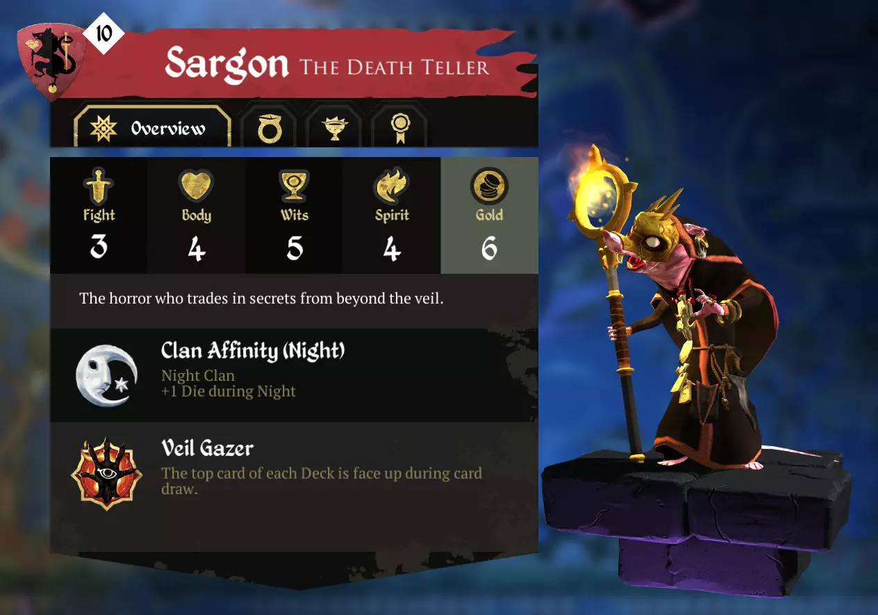 在龙族加入之前,萨贡实际上是腐败胜利的首选英雄。他高额的智慧和精神属性让他能轻松从法术牌组中筛选出腐败法术,而他的技能“面纱凝视者”则能让他迅速获取物品牌组或诡计牌组顶端的任何腐败卡牌。如果你敢在萨贡在场的情况下尝试腐败胜利,很快就会发现自己被他远远甩在身后,毫无还手之力,因为他会把你所有的骰子都据为己有。 如今,他作为腐败领主的统治已不像从前那样稳固。毫无疑问,他仍然能筛选法术牌组,但诡计牌组中已不再包含腐败卡牌(除非你想用“瘟疫使者”自杀),而且任何装备了“毁灭”护身符的施法者都能达到甚至超越你的腐败值增长速度。这一点对沃洛达尔和他的鳞爪党羽尤为适用,因为即便萨argon能比他们更快积累腐化值,一旦发生战斗,他也无法充分利用他们的腐化值带来的全部收益。龙类实际上对任何腐化值高于自身的目标都拥有一个免费的【镜像术】效果,这对那些想要通过腐化胜利的非龙类角色来说相当棘手。 那么我们能拿这只丑老鼠怎么办呢?让我们来看看他的属性: 3点战斗值。游戏中第二低的战斗属性,仅高于萨娜和约尔达娜的2点。你在物理方面不会有太强的压迫感,但如果你真的想(或者你的任务要求你提升),可以把这个属性点上去。 4点生命值。游戏中最低的生命属性。这非常危险。两张法术牌就能让你直接死亡。如果你无法决定选择哪个任务(或护身符),不妨认真考虑提升这项属性。 5点智慧值。作为鼠族的典型特征,他拥有游戏中最高的基础智慧值。这使得抽卡和出牌变得非常轻松,让你能更频繁地找到腐化卡牌。同时也有助于清除那些烦人的危险区域。 4点精神值。游戏中第二高的基础精神值。结合他高额的智慧值,清除危险区域和使用法术卡牌变得易如反掌。抽到法术卡牌也是获取腐化值的绝佳途径!(发现规律了吗?) 【面纱凝视者】:抽卡时可以查看每个牌堆顶端的卡牌。理论上,这意味着你的手牌总能充满当前情境下最优质、最相关的卡牌,让你对任何情况都能应对自如。实际上,这意味着你有权查看即将抽到的废牌。 如此低的战斗属性,弑君胜利基本不可能。威望也很难获得,因为在被腐化前,击杀英雄和灾祸会更困难,而且萨argon不像安珀那样能用钻石戒指来缓解这个问题。所以你最好的选择是灵石胜利和腐化胜利。但怎么会有人去追求这两个截然相反的目标呢?哇,这几乎就像他的背景故事里写的那样…… 装备选择 戒指 我先来说戒指,因为有一个非常重要的事实我想先说明白。