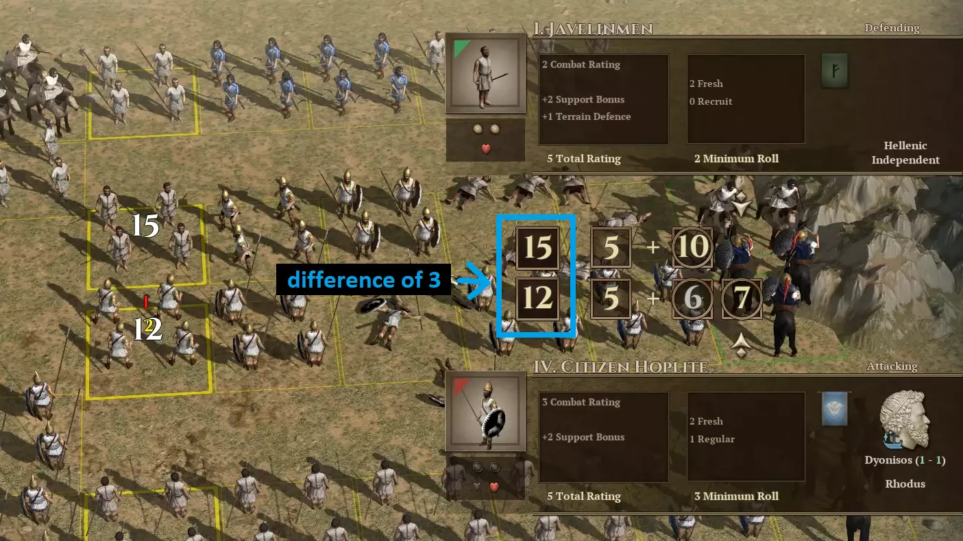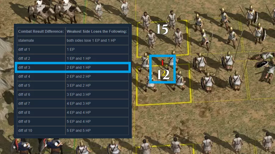 战斗结果图表 效能值在下表中缩写为【EP】,生命值缩写为【HP】。 战斗结果差异:劣势方损失如下: 平局:双方各损失1EP和1HP 差异1:1EP 差异2:1EP和1HP 差异3:2EP和1HP 差异4:2EP和2HP 差异5:3EP和2HP 差异6:3EP和3HP 差异7:4EP和3HP 差异8:4EP和4HP 差异9:5EP和4HP 差异10:5EP和5HP 示例 我方公民重步兵与敌方标枪兵进行决斗。经过所有掷骰和修正后,敌方标枪兵的评分是15,而我方公民重步兵的评分是12。