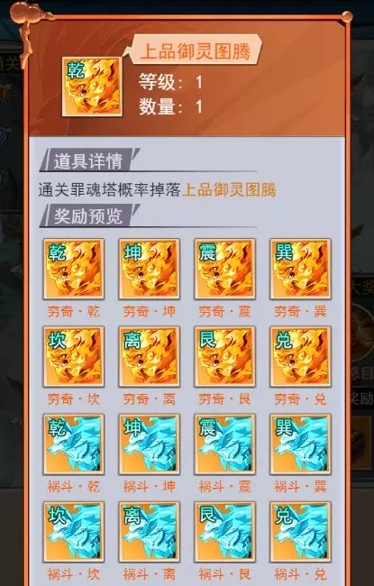 2、玩家闯关的层数越高,获得御灵图腾的几率越高,品质就越好。